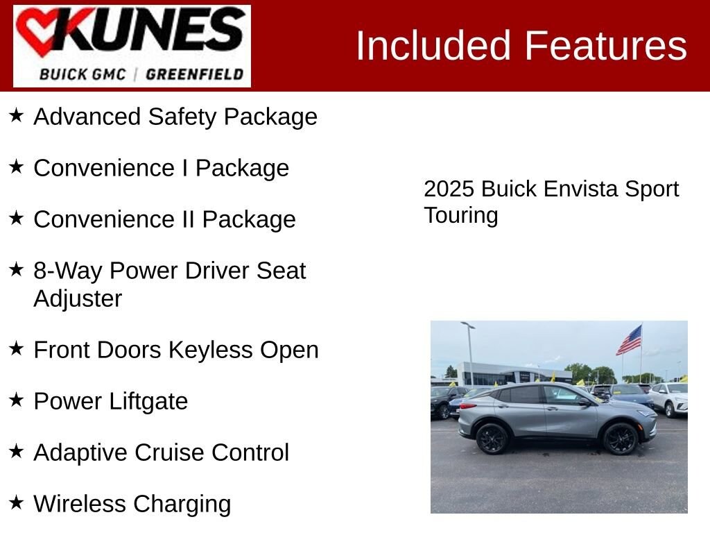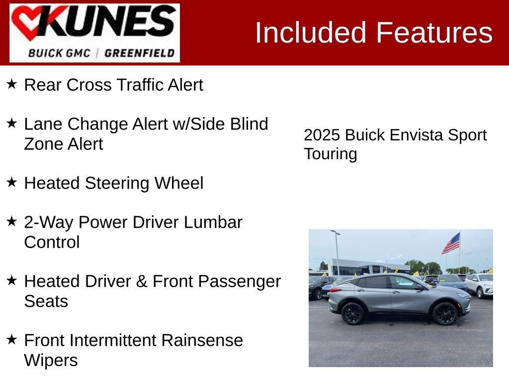 2-Way Power Driver Lumbar Control, 8-Way Power Driver Seat Adjuster, Adaptive Cruise Control, Advanced Safety Package, Convenience I Package, Convenience II Package, Front Doors Keyless Open, Front Intermittent Rainsense Wipers, Heated Driver & Front Passenger Seats, Heated Steering Wheel, Lane Change Alert w/Side Blind Zone Alert, Power Liftgate, Rear Cross Traffic Alert, Wireless Charging. Gray Metallic 2025 Buick Envista Sport Touring FWD 6-Speed Automatic 28/32 City/Highway MPG ECOTEC 1.2L Turbo