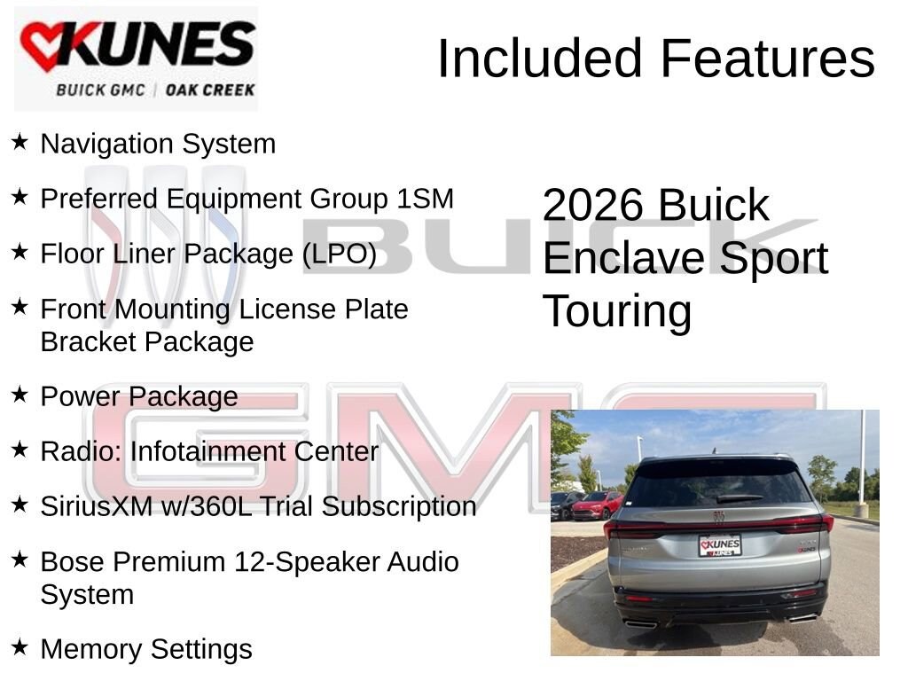 moonstone gray metallic 2026 Buick Enclave Sport Touring AWD 8-Speed Automatic 2.5L DOHC AWD, 110-Volt Power Outlet, 2nd Row 1-Touch Flat Folding Seat, Front Mounting License Plate Bracket Package, Head-Up Display, Heated steering wheel, Heated Wiper Park, Memory Settings, Navigation System, Perforated Leatherette Seat Trim, Power Liftgate, Power Package, Preferred Equipment Group 1SM, Radio: Infotainment Center, Remote keyless entry, Universal Home Remote, Wireless Apple CarPlay, Wireless Google Android Auto.