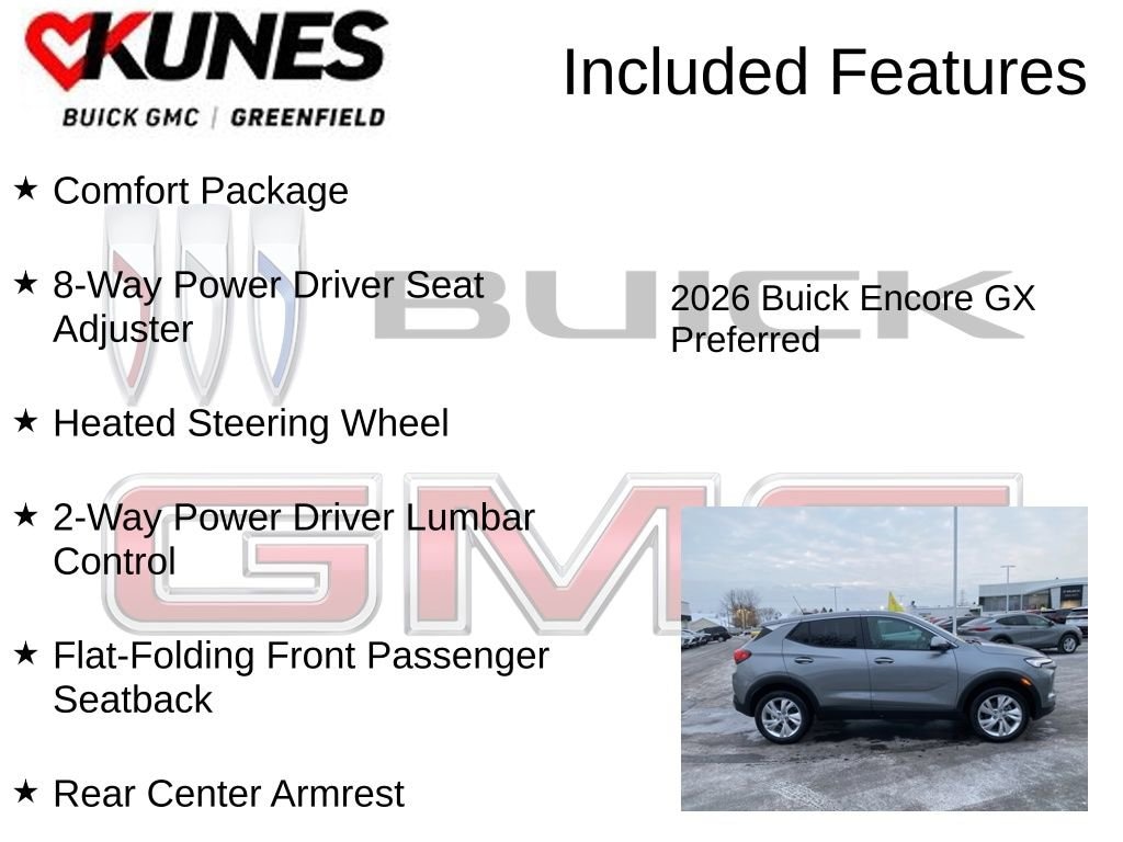 2-Way Power Driver Lumbar Control, 8-Way Power Driver Seat Adjuster, Comfort Package, Flat-Folding Front Passenger Seatback, Heated Driver and Front Passenger Seats, Heated Steering Wheel, Rear Center Armrest. Moonstone 2026 Buick Encore GX Preferred AWD 9-Speed Automatic 26/28 City/Highway MPG ECOTEC 1.3L Turbo