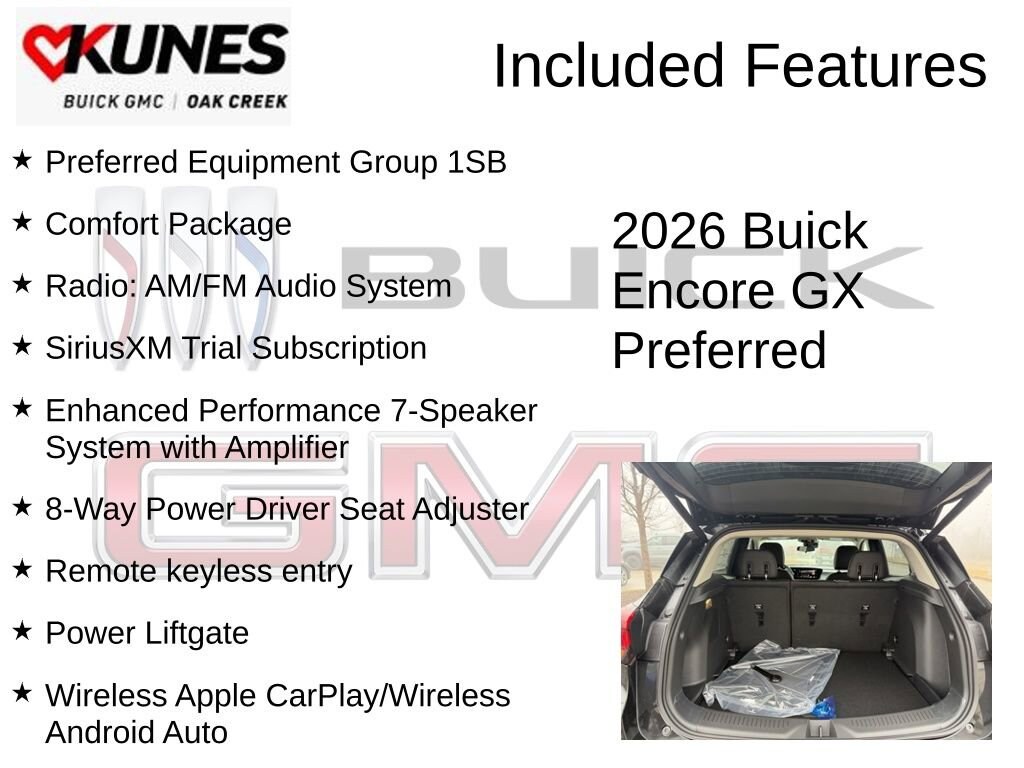 Ebony Twilight Metallic 2026 Buick Encore GX Preferred AWD 9-Speed Automatic ECOTEC 1.3L Turbo 2-Way Power Driver Lumbar Control, 8-Way Power Driver Seat Adjuster, Comfort Package, Enhanced Performance 7-Speaker System with Amplifier, Flat-Folding Front Passenger Seatback, Heated Driver and Front Passenger Seats, Heated Steering Wheel, Power Liftgate, Preferred Equipment Group 1SB, Radio: AM/FM Audio System, Rear Center Armrest, Remote keyless entry, SiriusXM Trial Subscription, Wireless Apple CarPlay/Wireless Android Auto.Recent Arrival! 26/28 City/Highway MPGAlso included with every new vehicle we sell: LIFETIME NO FEAR WARRANTY, FIRST OIL CHANGE, and AT HOME COURTESY DELIVERY! Call us for full details! We pride ourselves on honesty and integrity, but please note that mistakes or misprints due to human error are possible. Find out why our dealerships have won DealerRater.com DEALER OF THE YEAR a whopping 10 TIMES! Call, email, or live chat with one of our friendly sales professionals now to schedule your test drive! Prices shown do not include tax, title, registration and $599 service fees.