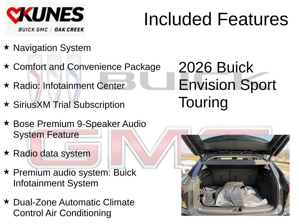 Ebony Twilight Metallic 2026 Buick Envision Sport Touring AWD 9-Speed Automatic 2.0L Turbocharged 3-Channel Programmable Universal Home Remote, 30 Diagonal LCD Display, Air Quality Indicator Sensor, Automatic Air Recirculation, Bose Premium 9-Speaker Audio System Feature, Comfort and Convenience Package, Dual-Zone Automatic Climate Control Air Conditioning, Hands-Free Power Programmable Liftgate, Heated Driver and Front Passenger Seats, Heated Steering Wheel, Navigation System, Power Liftgate, Power Panoramic Tilt-Sliding Moonroof, Premium audio system: Buick Infotainment System, Radio data system, Radio: Infotainment Center, Remote keyless entry, SiriusXM Trial Subscription, Wireless Apple CarPlay/Wireless Android Auto.