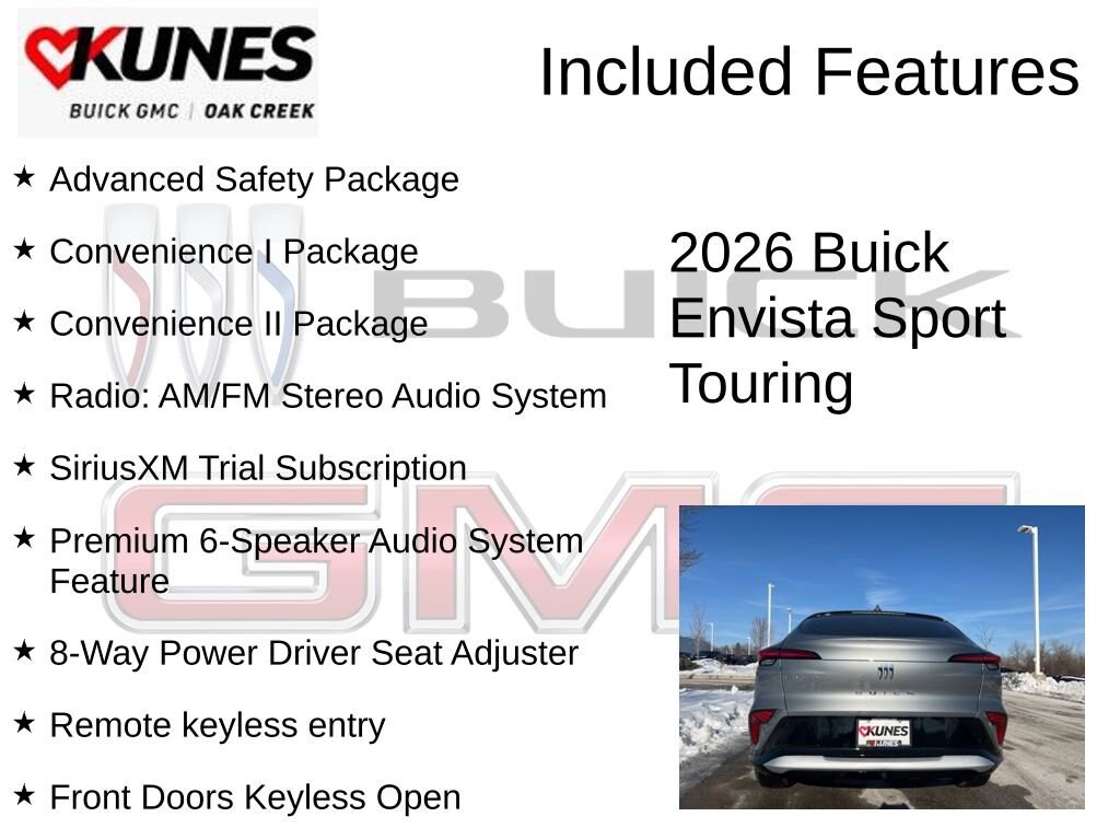 Moonstone Gray Metallic 2026 Buick Envista Sport Touring FWD 6-Speed Automatic ECOTEC 1.2L Turbo 2 USB Ports (1 Type-A, 1 Type-C), 2-Way Power Driver Lumbar Control, 8-Way Power Driver Seat Adjuster, Adaptive Cruise Control, Advanced Safety Package, Convenience I Package, Convenience II Package, Front Doors Keyless Open, Front Intermittent Rainsense Wipers, Heated Steering Wheel, Power Liftgate, Premium 6-Speaker Audio System Feature, Radio: AM/FM Stereo Audio System, Rear Cross Traffic Alert, Rear Parking Sensors, Remote keyless entry, SiriusXM Trial Subscription, Wheels: 18 Black Painted Aluminum, Wireless Apple CarPlay/Wireless Android Auto, Wireless Charging.