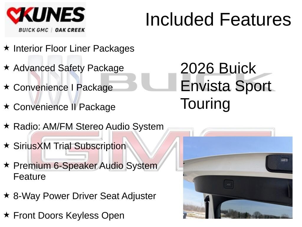 Summit White 2026 Buick Envista Sport Touring FWD 6-Speed Automatic ECOTEC 1.2L Turbo 2 USB Ports (1 Type-A, 1 Type-C), 2-Way Power Driver Lumbar Control, 8-Way Power Driver Seat Adjuster, Adaptive Cruise Control, Advanced Safety Package, All-Weather Floor Liners, Brake assist, Cargo Liner, Convenience I Package, Convenience II Package, Electronic Stability Control, Exterior Parking Camera Rear, Front Doors Keyless Open, Front Intermittent Rainsense Wipers, Heated Driver and Front Passenger Seats, Heated Steering Wheel, Interior Floor Liner Packages, Lane Change Alert with Side Blind Zone Alert, Leatherette Seat Trim, Power Liftgate, Premium 6-Speaker Audio System Feature, Radio: AM/FM Stereo Audio System, Rear Cross Traffic Alert, Rear Parking Sensors, SiriusXM Trial Subscription, Wheels: 19 Black Painted Aluminum, Wireless Apple CarPlay/Wireless Android Auto, Wireless Charging.