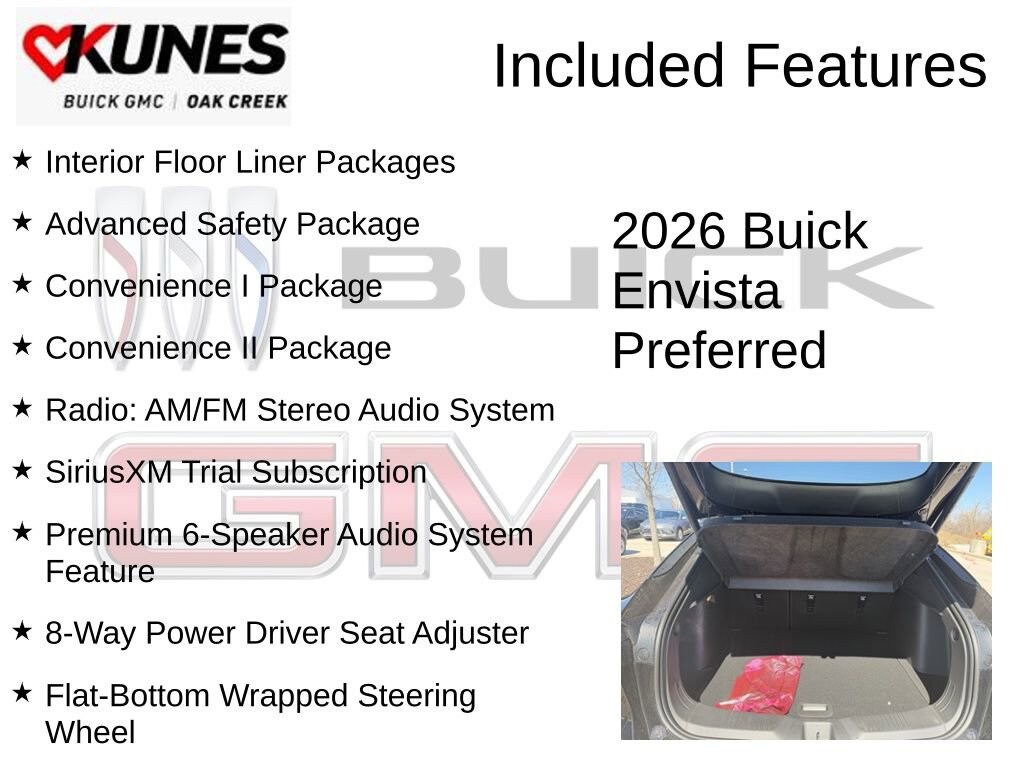 Ebony Twilight Metallic 2026 Buick Envista Preferred FWD 6-Speed Automatic ECOTEC 1.2L Turbo 2 USB Ports (1 Type-A, 1 Type-C), 2-Way Power Driver Lumbar Control, 8-Way Power Driver Seat Adjuster, Adaptive Cruise Control, Advanced Safety Package, All-Weather Floor Liners, Cargo Liner, Convenience I Package, Convenience II Package, Exterior Parking Camera Rear, Flat-Bottom Wrapped Steering Wheel, Front Doors Keyless Open, Front Intermittent Rainsense Wipers, Heated Driver and Front Passenger Seats, Heated Steering Wheel, Interior Floor Liner Packages, Lane Change Alert with Side Blind Zone Alert, Power Liftgate, Premium 6-Speaker Audio System Feature, Radio: AM/FM Stereo Audio System, Rear Cross Traffic Alert, Rear Parking Sensors, SiriusXM Trial Subscription, Wireless Apple CarPlay/Wireless Android Auto, Wireless Charging.