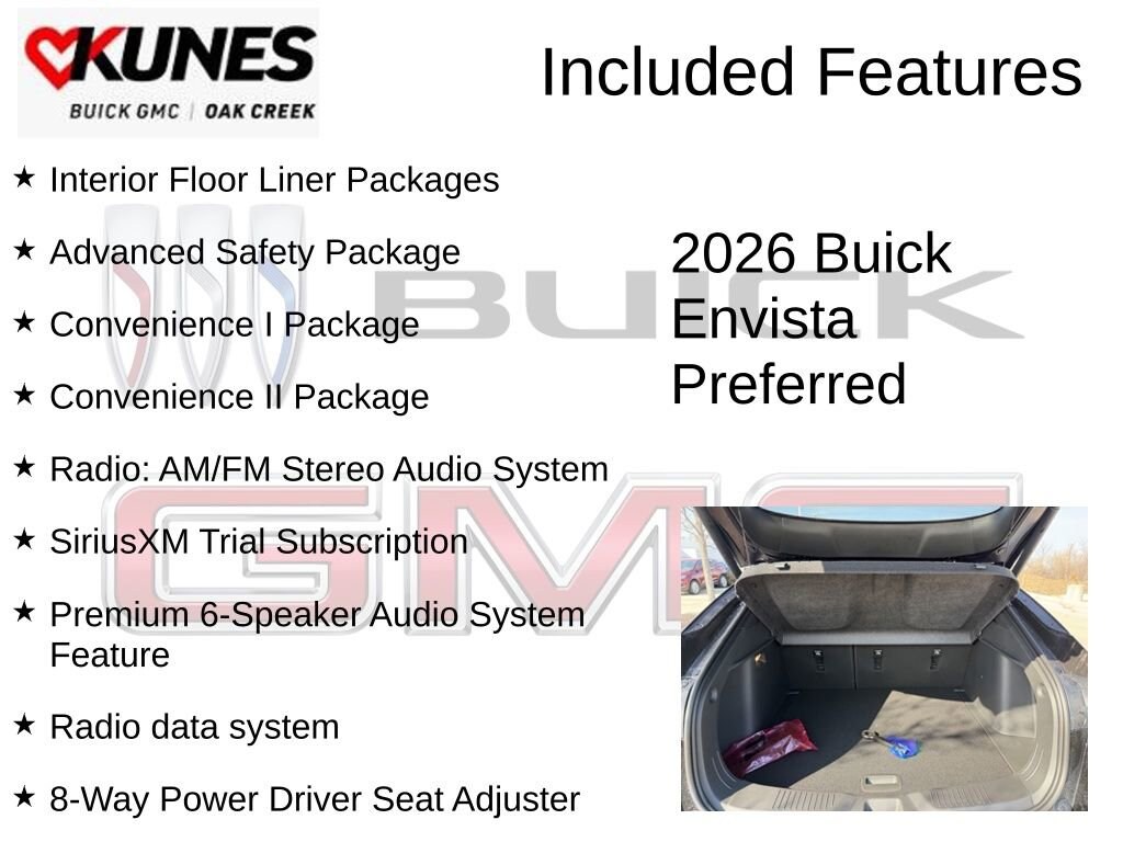 Ebony Twilight Metallic 2026 Buick Envista Preferred FWD 6-Speed Automatic ECOTEC 1.2L Turbo 2 USB Ports (1 Type-A, 1 Type-C), 2-Way Power Driver Lumbar Control, 8-Way Power Driver Seat Adjuster, Adaptive Cruise Control, Advanced Safety Package, All-Weather Floor Liners, Cargo Liner, Convenience I Package, Convenience II Package, Exterior Parking Camera Rear, Flat-Bottom Wrapped Steering Wheel, Front Doors Keyless Open, Front Intermittent Rainsense Wipers, Heated Driver and Front Passenger Seats, Heated Steering Wheel, Interior Floor Liner Packages, Lane Change Alert with Side Blind Zone Alert, Power Liftgate, Premium 6-Speaker Audio System Feature, Radio data system, Radio: AM/FM Stereo Audio System, Rear Cross Traffic Alert, Rear Parking Sensors, Remote keyless entry, SiriusXM Trial Subscription, Wireless Apple CarPlay/Wireless Android Auto, Wireless Charging.