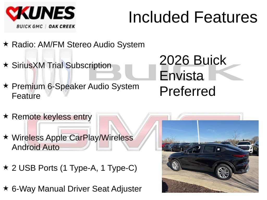 Ebony Twilight Metallic 2026 Buick Envista Preferred FWD 6-Speed Automatic ECOTEC 1.2L Turbo 2 USB Ports (1 Type-A, 1 Type-C), 6-Way Manual Driver Seat Adjuster, Premium 6-Speaker Audio System Feature, Radio: AM/FM Stereo Audio System, Remote keyless entry, SiriusXM Trial Subscription, Wireless Apple CarPlay/Wireless Android Auto.