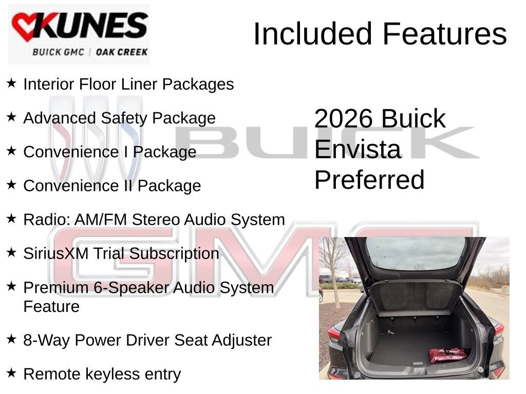 Ebony Twilight Metallic 2026 Buick Envista Preferred FWD 6-Speed Automatic ECOTEC 1.2L Turbo 2 USB Ports (1 Type-A, 1 Type-C), 2-Way Power Driver Lumbar Control, 8-Way Power Driver Seat Adjuster, Adaptive Cruise Control, Advanced Safety Package, All-Weather Floor Liners, Cargo Liner, Convenience I Package, Convenience II Package, Exterior Parking Camera Rear, Flat-Bottom Wrapped Steering Wheel, Front Doors Keyless Open, Front Intermittent Rainsense Wipers, Heated Driver and Front Passenger Seats, Heated Steering Wheel, Interior Floor Liner Packages, Lane Change Alert with Side Blind Zone Alert, Power Liftgate, Premium 6-Speaker Audio System Feature, Radio: AM/FM Stereo Audio System, Rear Cross Traffic Alert, Rear Parking Sensors, Remote keyless entry, SiriusXM Trial Subscription, Wheels: 17 Bright Silver Painted Aluminum, Wireless Apple CarPlay/Wireless Android Auto, Wireless Charging.28/32 City/Highway MPGAlso included with every new vehicle we sell: LIFETIME NO FEAR WARRANTY, FIRST OIL CHANGE, and AT HOME COURTESY DELIVERY! Call us for full details! We pride ourselves on honesty and integrity, but please note that mistakes or misprints due to human error are possible. Find out why our dealerships have won DealerRater.com DEALER OF THE YEAR a whopping 10 TIMES! Call, email, or live chat with one of our friendly sales professionals now to schedule your test drive! Prices shown do not include tax, title, registration and $599 service fees. Price includes: $750 - Buick GMC Bonus Cash. Exp. 04/30/2026