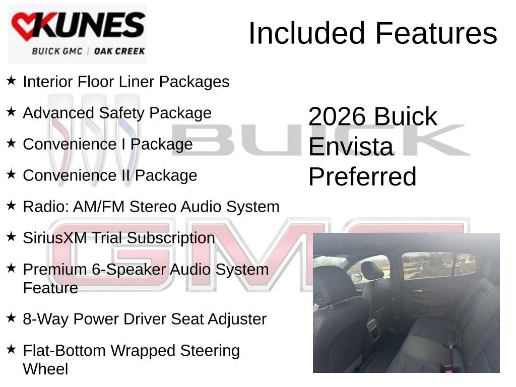 Ebony Twilight Metallic 2026 Buick Envista Preferred FWD 6-Speed Automatic ECOTEC 1.2L Turbo 2 USB Ports (1 Type-A, 1 Type-C), 2-Way Power Driver Lumbar Control, 8-Way Power Driver Seat Adjuster, Adaptive Cruise Control, Advanced Safety Package, All-Weather Floor Liners, Cargo Liner, Convenience I Package, Convenience II Package, Exterior Parking Camera Rear, Flat-Bottom Wrapped Steering Wheel, Front Doors Keyless Open, Front Intermittent Rainsense Wipers, Heated Driver and Front Passenger Seats, Heated Steering Wheel, Interior Floor Liner Packages, Lane Change Alert with Side Blind Zone Alert, Power Liftgate, Premium 6-Speaker Audio System Feature, Radio: AM/FM Stereo Audio System, Rear Cross Traffic Alert, Rear Parking Sensors, SiriusXM Trial Subscription, Wireless Apple CarPlay/Wireless Android Auto, Wireless Charging.28/32 City/Highway MPGAlso included with every new vehicle we sell: LIFETIME NO FEAR WARRANTY, FIRST OIL CHANGE, and AT HOME COURTESY DELIVERY! Call us for full details! We pride ourselves on honesty and integrity, but please note that mistakes or misprints due to human error are possible. Find out why our dealerships have won DealerRater.com DEALER OF THE YEAR a whopping 10 TIMES! Call, email, or live chat with one of our friendly sales professionals now to schedule your test drive! Prices shown do not include tax, title, registration and $599 service fees. Price includes: $750 - Buick GMC Bonus Cash. Exp. 04/30/2026