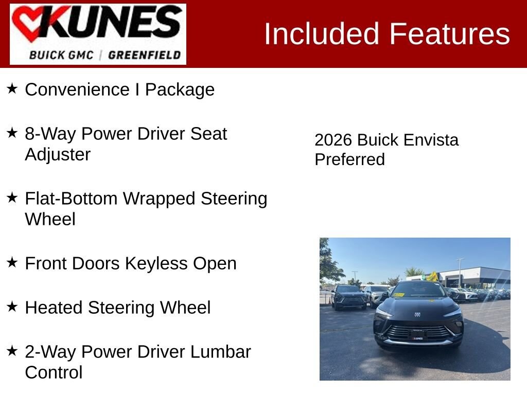 2-Way Power Driver Lumbar Control, 8-Way Power Driver Seat Adjuster, Convenience I Package, Flat-Bottom Wrapped Steering Wheel, Front Doors Keyless Open, Heated Driver & Front Passenger Seats, Heated Steering Wheel. Ebony Twilight Metallic 2026 Buick Envista Preferred FWD 6-Speed Automatic 28/32 City/Highway MPG ECOTEC 1.2L Turbo
