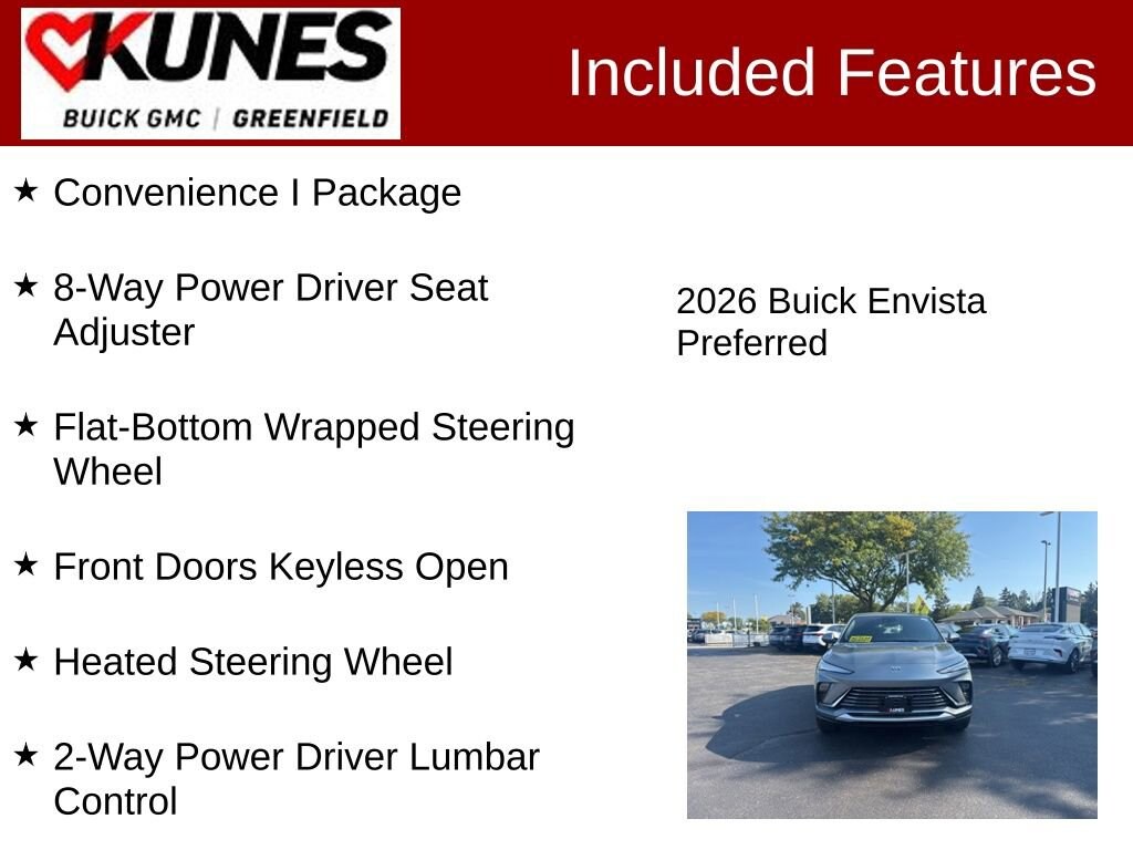 2-Way Power Driver Lumbar Control, 8-Way Power Driver Seat Adjuster, Convenience I Package, Flat-Bottom Wrapped Steering Wheel, Front Doors Keyless Open, Heated Driver & Front Passenger Seats, Heated Steering Wheel. Moonstone 2026 Buick Envista Preferred FWD 6-Speed Automatic 28/32 City/Highway MPG ECOTEC 1.2L Turbo
