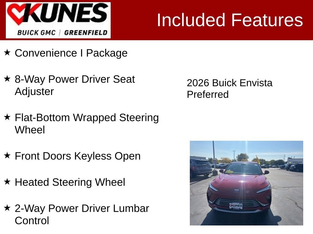 2-Way Power Driver Lumbar Control, 8-Way Power Driver Seat Adjuster, Convenience I Package, Flat-Bottom Wrapped Steering Wheel, Front Doors Keyless Open, Heated Driver & Front Passenger Seats, Heated Steering Wheel. Brilliant Red 2026 Buick Envista Preferred FWD 6-Speed Automatic 28/32 City/Highway MPG ECOTEC 1.2L Turbo