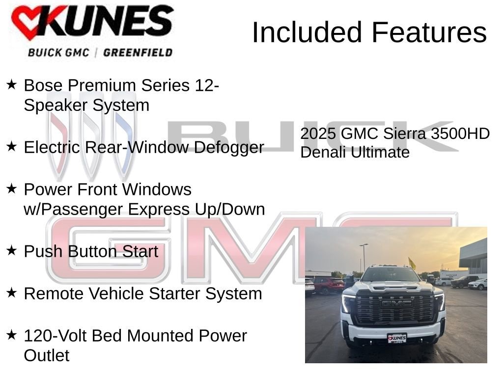 10-Speed Automatic, 4WD, Alpine Umber Leather, 120-Volt Bed Mounted Power Outlet, 120-Volt Instrument Panel Power Outlet, 16-Way Power Driver Seat Adjuster w/Lumbar, 16-Way Power Passenger Seat Adjuster w/Lumbar, 2 Charge-Only Rear USB Ports, 2 Charge/Data USB Ports Inside Center Console, 2 USB Ports, 2-Speed Active Transfer Case, 220 Amp Alternator, Auto High-beam Headlights, Auto-Dimming Inside Rearview Mirror w/Camera, Bed View Camera w/2 Trailer Camera Provisions, Block heater, Bose Premium Series 12-Speaker System, Deep-Tinted Glass, Dual Heavy-Duty 70 Amp-Hr Battery, Electric Rear-Window Defogger, Floor-Mounted Center Console, Forward Collision Alert, Front Pedestrian Braking, Front Rain-Sensing Wipers, Full Grain Leather Seat Trim, Genuine wood dashboard insert, Genuine wood door panel insert, GMC Premium 13.4 Diagonal Information Display, Gooseneck/5th Wheel Prep Package, HD Surround Vision, Heads-Up Display, Heated 2nd Row Outboard Seats, Heated Driver & Front Outboard Passenger Seats, Heated steering wheel, Hill Descent Control, Hitch Guidance w/Hitch View, In-Vehicle Trailering App, IntelliBeam Automatic High Beam On/Off, Keyless Open & Start, Lane Departure Warning System, LED Cargo Area Lighting, LED Smoked Amber Roof Marker Lamps, Manual Tilt-Wheel/Telescoping Steering Column, Memory seat, Multicolor 15 Diagonal Head-Up Display, Power Front Windows w/Passenger Express Up/Down, Power Sliding Rear Window w/Defogger, Power Sunroof, Preferred Equipment Group 5SB, ProGrade Trailering System, Push Button Start, Rain sensing wipers, Rear Cross Traffic Alert, Rear Wheelhouse Liners, Remote Vehicle Starter System, Safety Alert Seat, Signature Denali Ultimate Grille in Vader Chrome, SiriusXM w/360L Trial Subscription, Snow Plow Prep/Camper Package, Spray-On Pickup Bedliner w/GMC Logo, Steering Wheel Audio Controls, Technology Package, Trailer Camera Provisions, Trailer Side Blind Zone Alert, Trailer Tire Pressure Monitor Sensors, Ultrasonic Front & Rear Park Assist, Unauthorized Entry Theft-Deterrent System, Universal Home Remote, Ventilated Driver & Front Passenger Seats, Wireless Charging, Wireless Phone Projection, X31 Off-Road Package. Summit White 2025 GMC Sierra 3500HD Denali Ultimate 4WD 10-Speed Automatic Duramax 6.6L V8 Turbodiesel