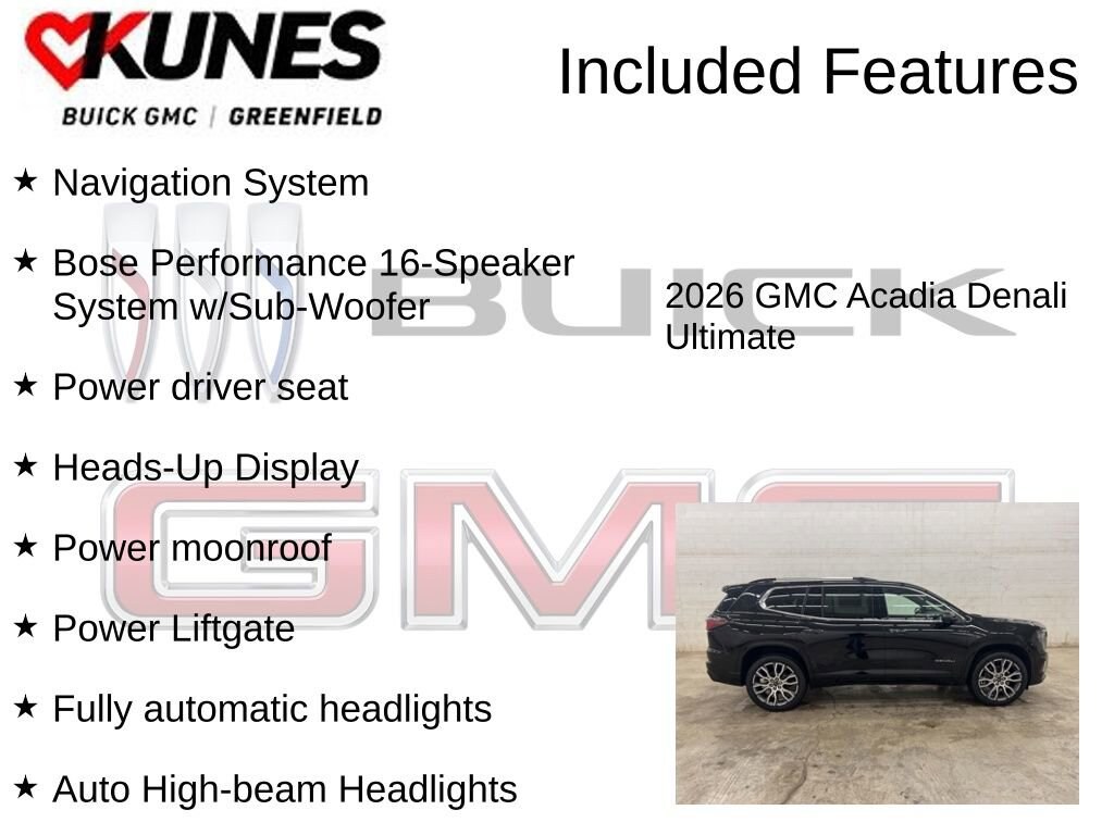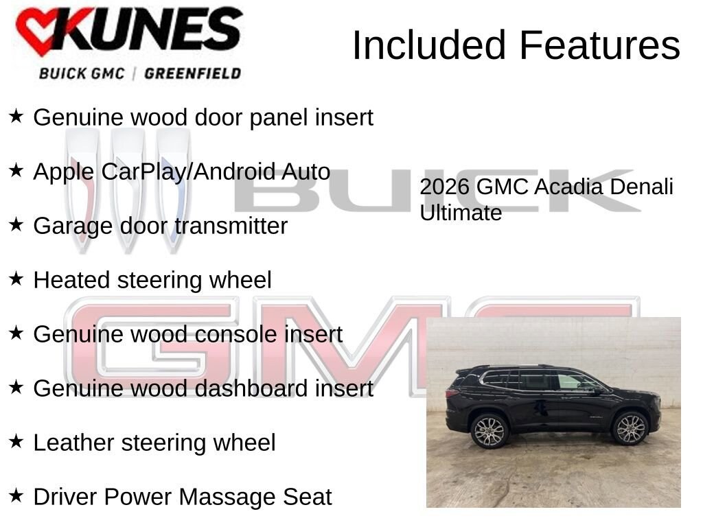 AWD, Woodland Mahogany Leather, Alloy wheels, Apple CarPlay/Android Auto, Auto High-beam Headlights, Bose Performance 16-Speaker System w/Sub-Woofer, Driver Power Massage Seat, Front Passenger Power Massage Seat, Full Leather Seat Trim, Fully automatic headlights, Garage door transmitter, Genuine wood console insert, Genuine wood dashboard insert, Genuine wood door panel insert, Heads-Up Display, Heated front seats, Heated rear seats, Heated steering wheel, Leather steering wheel, Navigation System, Power driver seat, Power Liftgate, Power moonroof, Rain sensing wipers, Ventilated front seats. Ebony Twilight Metallic 2026 GMC Acadia Denali Ultimate AWD 8-Speed Automatic 2.5L DOHCAlso included with every new vehicle we sell: LIFETIME NO FEAR WARRANTY, FIRST OIL CHANGE, and AT HOME COURTESY DELIVERY! Call us for full details! We pride ourselves on honesty and integrity, but please note that mistakes or misprints due to human error are possible. Find out why our dealerships have won DealerRater.com DEALER OF THE YEAR a whopping 10 TIMES! Call, email, or live chat with one of our friendly sales professionals now to schedule your test drive! Prices shown do not include tax, title, registration and $599 service fees.