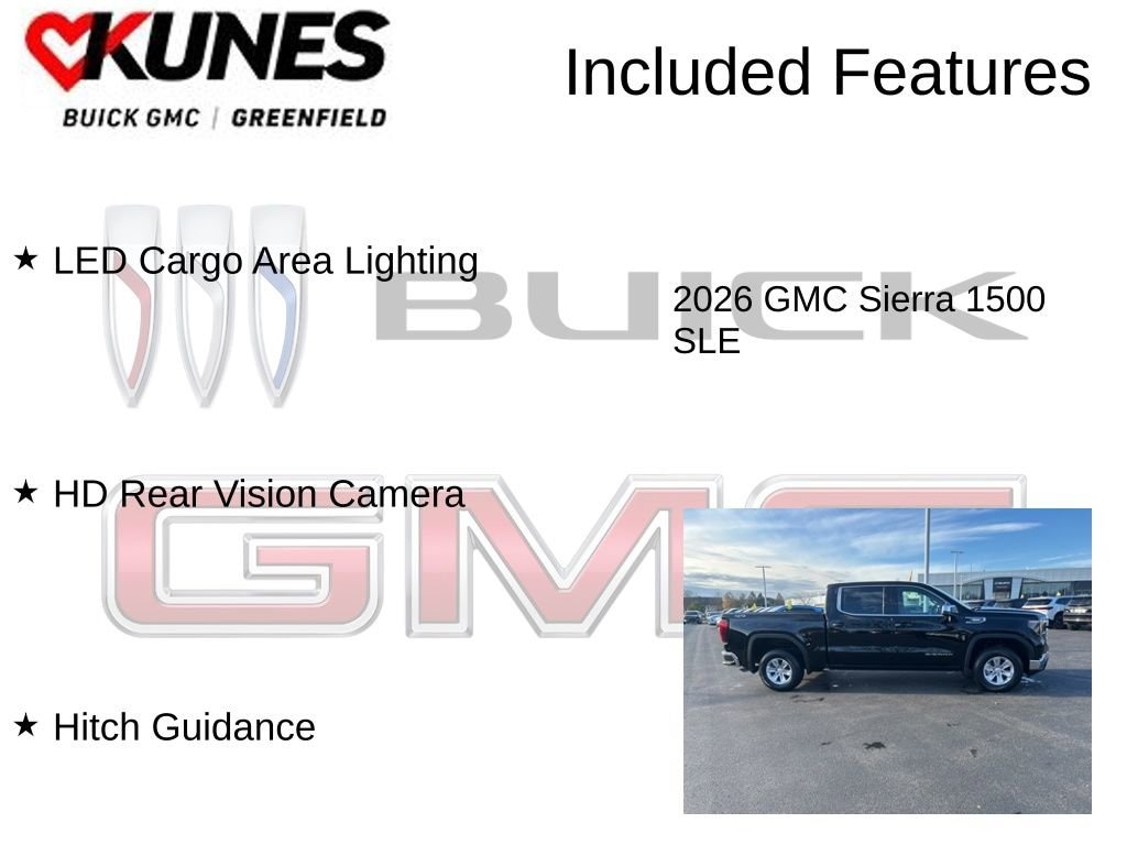10-Speed Automatic, 4WD, Black Cloth, Auto-Locking Rear Differential, Dual-Zone Automatic Climate Control, Electric Rear-Window Defogger, HD Rear Vision Camera, Hitch Guidance, LED Cargo Area Lighting, Remote Start Package, Remote Vehicle Starter System, SLE Convenience Package, SLE Value Package, Trailering Package. Onyx Black 2026 GMC Sierra 1500 SLE 4WD 10-Speed Automatic 3.0L I6