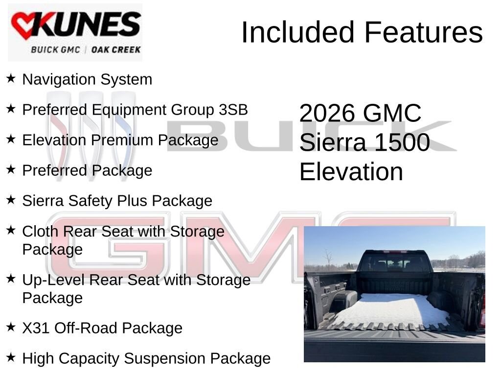 Onyx Black 2026 GMC Sierra 1500 Elevation 4WD 10-Speed Automatic EcoTec3 5.3L V8 10-Speed Automatic, 4WD, Black Leather, 10-Way Power Driver Seat Adjuster with Lumbar, 120-Volt Bed Mounted Power Outlet, 120-Volt Interior Power Outlet, 2 Charge/Data USB Ports, 2 Type-C Charge-Only Rear USB Ports, 4-Way Manual Passenger Seat Adjuster, 6-Speaker Audio System Feature, 6 Rectangular Black Tubular Assist Steps, Adaptive Cruise Control, All-Weather Floor Liner, Auto-Locking Rear Differential, Body Color Header with Gloss Black Mesh Grille Bars, Cloth Rear Seat with Storage Package, Color-Keyed Carpeting Floor Covering, Deep-Tinted Glass, Dual Exhaust System, Electric Rear-Window Defogger, Elevation Premium Package, Front 40/20/40 Split-Bench Seat, Front Frame-Mounted Black Recovery Hooks, Front Rubberized-Vinyl Floor Mats, HD Rear Vision Camera, HD Surround Vision, Heated Driver and Front Outboard Passenger Seating, Heavy-Duty Air Filter, High Capacity Suspension Package, High Gloss Black Mirror Caps, Hill Descent Control, Hitch Guidance, Hitch View, in-Vehicle Trailering System App, Integrated Trailer Brake Controller, Keyless Open and Start, Leather-Appointed Seat Trim, LED Cargo Area Lighting, Manual Tilt-Wheel and Telescoping Steering Column, Navigation System, Off-Road Suspension, OnStar Services Capable, Perimeter Lighting, Power Door Locks, Power Front Windows with Driver Express Up/Down, Power Front Windows with Passenger Express Down, Power Rear Windows with Express Down, Power Sliding Rear Window with Rear Defogger, Preferred Equipment Group 3SB, Preferred Package, Premium Bose 7-Speaker Sound System, Push Button Start, Rear Cross Traffic Braking, Rear Pedestrian Detection, Rear Rubberized-Vinyl Floor Mats, Rear Wheelhouse Liners, Remote Vehicle Starter System, Sierra Safety Plus Package, SiriusXM with 360L Trial Subscription, Spray-on Pickup Bedliner with GMC Logo, Steering Wheel Audio Controls, Theft Deterrent System (unauthorized Entry), Trailer Camera Provisions, Trailer Side Blind Zone Alert, Trailering Package, Ultrasonic Front and Rear Park Assist, Universal Home Remote, Up-Level Rear Seat with Storage Package, Wi-Fi Hotspot Capable, X31 Hard Badge, X31 Off-Road Package.