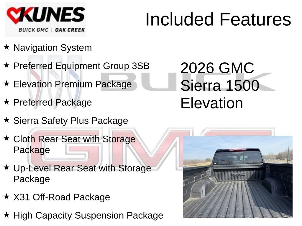 Onyx Black 2026 GMC Sierra 1500 Elevation 4WD 10-Speed Automatic EcoTec3 5.3L V8 10-Speed Automatic, 4WD, Black Leather, 10-Way Power Driver Seat Adjuster with Lumbar, 120-Volt Bed Mounted Power Outlet, 120-Volt Interior Power Outlet, 2 Charge/Data USB Ports, 2 Type-C Charge-Only Rear USB Ports, 4-Way Manual Passenger Seat Adjuster, 6-Speaker Audio System Feature, 6 Rectangular Black Tubular Assist Steps, Adaptive Cruise Control, Auto-Locking Rear Differential, Body Color Header with Gloss Black Mesh Grille Bars, Cloth Rear Seat with Storage Package, Color-Keyed Carpeting Floor Covering, Deep-Tinted Glass, Dual Exhaust System, Electric Rear-Window Defogger, Elevation Premium Package, Front 40/20/40 Split-Bench Seat, Front Frame-Mounted Black Recovery Hooks, Front Rubberized-Vinyl Floor Mats, HD Rear Vision Camera, HD Surround Vision, Heated Driver and Front Outboard Passenger Seating, Heavy-Duty Air Filter, High Capacity Suspension Package, High Gloss Black Mirror Caps, Hill Descent Control, Hitch Guidance, Hitch View, in-Vehicle Trailering System App, Integrated Trailer Brake Controller, Keyless Open and Start, Leather-Appointed Seat Trim, LED Cargo Area Lighting, Manual Tilt-Wheel and Telescoping Steering Column, Navigation System, Off-Road Suspension, OnStar Services Capable, Perimeter Lighting, Power Door Locks, Power Front Windows with Driver Express Up/Down, Power Front Windows with Passenger Express Down, Power Rear Windows with Express Down, Power Sliding Rear Window with Rear Defogger, Preferred Equipment Group 3SB, Preferred Package, Premium Bose 7-Speaker Sound System, Push Button Start, Rear Cross Traffic Braking, Rear Pedestrian Detection, Rear Rubberized-Vinyl Floor Mats, Rear Wheelhouse Liners, Remote Vehicle Starter System, Sierra Safety Plus Package, SiriusXM with 360L Trial Subscription, Steering Wheel Audio Controls, Theft Deterrent System (unauthorized Entry), Trailer Camera Provisions, Trailer Side Blind Zone Alert, Trailering Package, Ultrasonic Front and Rear Park Assist, Universal Home Remote, Up-Level Rear Seat with Storage Package, Wi-Fi Hotspot Capable, X31 Hard Badge, X31 Off-Road Package.
