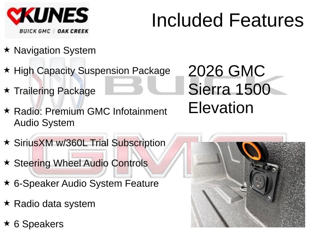 Downpour Metallic 2026 GMC Sierra 1500 Elevation 4WD 8-Speed Automatic 2.7L I4 Turbocharged DOHC 16V LEV3-SULEV30 310hp 8-Speed Automatic, 4WD, Black Cloth, 6 Speakers, 6-Speaker Audio System Feature, AM/FM radio: SiriusXM with 360L, Apple CarPlay/Android Auto, Heated Driver & Front Outboard Passenger Seating, High Capacity Suspension Package, Hitch Guidance, Navigation System, Push Button Start, Radio data system, Radio: Premium GMC Infotainment Audio System, Remote keyless entry, Remote Vehicle Starter System, Steering Wheel Audio Controls, Trailering Package, Wireless Apple CarPlay/Wireless Android Auto.