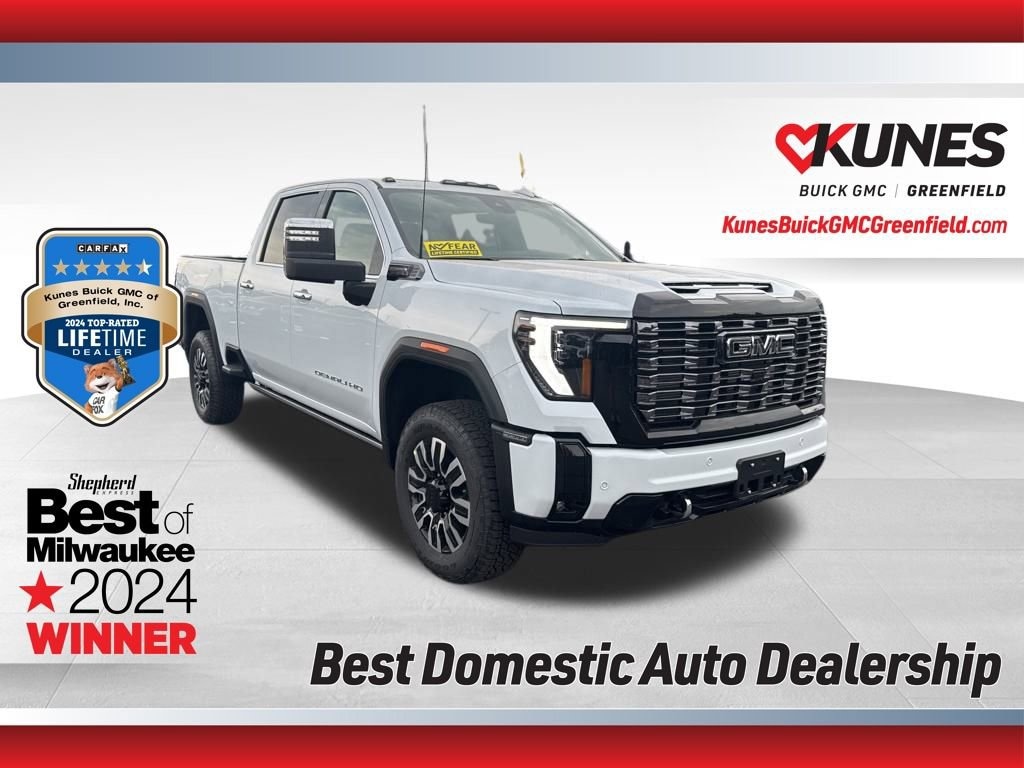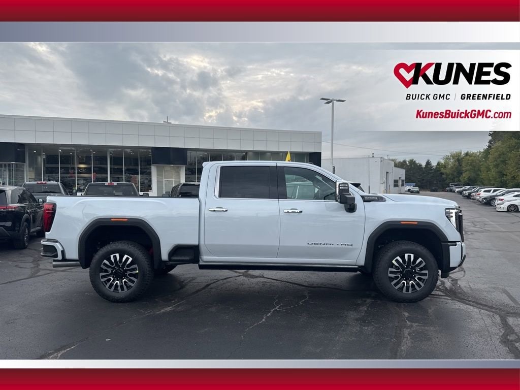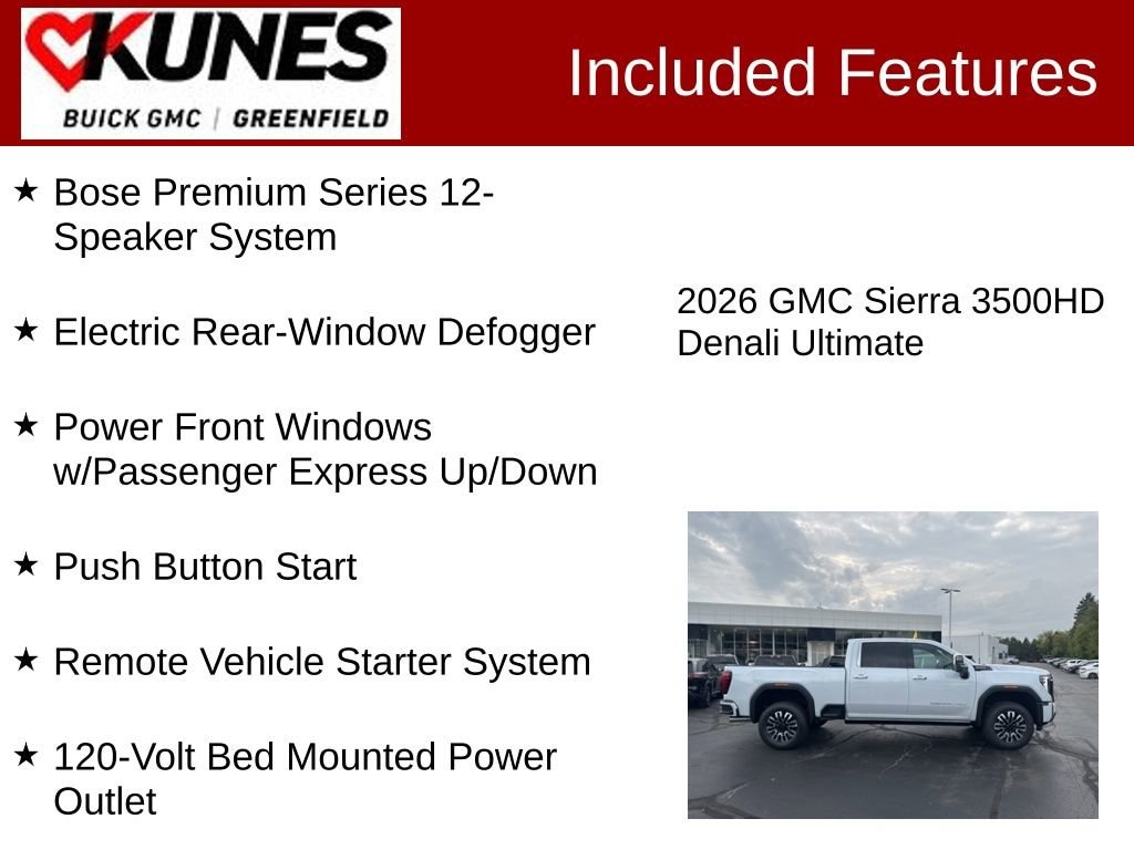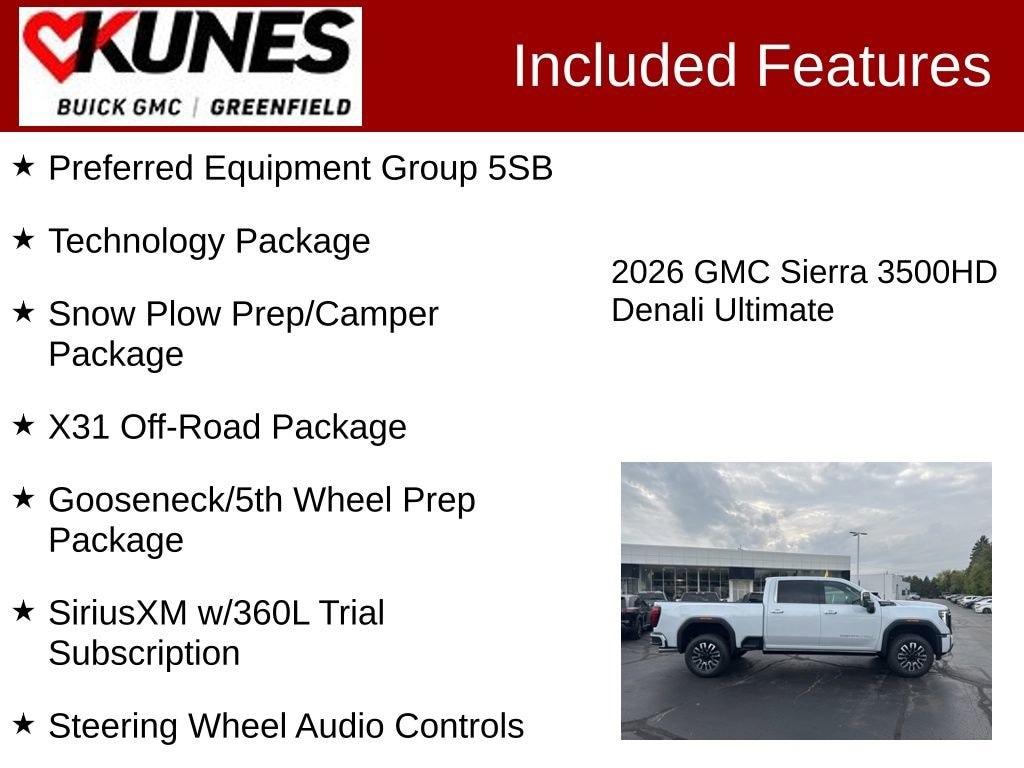10-Speed Automatic, 4WD, Alpine Umber Leather, 120-Volt Bed Mounted Power Outlet, 120-Volt Instrument Panel Power Outlet, 2 Charge-Only Rear USB Ports, 2 Charge/Data USB Ports Inside Center Console, 2 USB Ports, 2-Speed Active Transfer Case, 220 Amp Alternator, Auto-Dimming Inside Rearview Mirror w/Camera, Bed View Camera w/2 Trailer Camera Provisions, Bose Premium Series 12-Speaker System, Deep-Tinted Glass, Electric Rear-Window Defogger, Floor-Mounted Center Console, Front Rain-Sensing Wipers, Gooseneck/5th Wheel Prep Package, HD Surround Vision, Heated 2nd Row Outboard Seats, Heated Driver & Front Outboard Passenger Seats, Heated steering wheel, Hill Descent Control, Hitch Guidance w/Hitch View, In-Vehicle Trailering App, Keyless Open & Start, LED Cargo Area Lighting, LED Smoked Amber Roof Marker Lamps, Manual Tilt-Wheel/Telescoping Steering Column, Multicolor 15 Diagonal Head-Up Display, Power Front Windows w/Passenger Express Up/Down, Power Sliding Rear Window w/Defogger, Power Sunroof, Preferred Equipment Group 5SB, ProGrade Trailering System, Push Button Start, Rear Cross Traffic Alert, Rear Wheelhouse Liners, Remote Vehicle Starter System, Safety Alert Seat, Signature Denali Ultimate Grille in Vader Chrome, SiriusXM w/360L Trial Subscription, Snow Plow Prep/Camper Package, Spray-On Pickup Bedliner w/GMC Logo, Steering Wheel Audio Controls, Technology Package, Trailer Camera Provisions, Trailer Side Blind Zone Alert, Trailer Tire Pressure Monitor Sensors, Ultrasonic Front & Rear Park Assist, Unauthorized Entry Theft-Deterrent System, Universal Home Remote, Ventilated Driver & Front Passenger Seats, Wireless Charging, Wireless Phone Projection, X31 Off-Road Package. Glacier White 2026 GMC Sierra 3500HD Denali Ultimate 4WD 10-Speed Automatic Duramax 6.6L V8 Turbodiesel