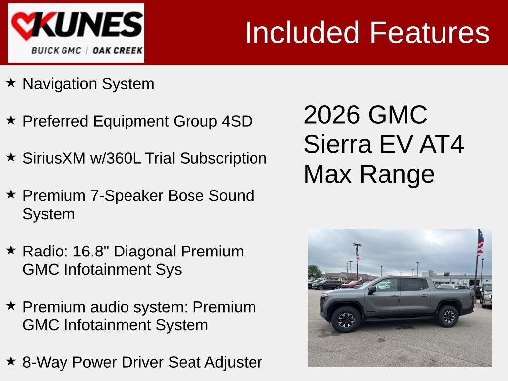 Magnus Matte 2026 GMC Sierra EV AWD 1-Speed Automatic Electric ZEV 725hp 4-Way Driver Power Lumbar Seat Adjuster, 4-Way Power Front Passenger Lumbar Seat Adjuster, 8-Way Power Driver Seat Adjuster, 8-Way Power Front Passenger Seat Adjuster, CoreTec Seat Trim, Heads-Up Display, Heated Front Driver & Passenger Seats, Max Range Battery Pack, Memory seat, Navigation System, Preferred Equipment Group 4SD, Premium 7-Speaker Bose Sound System, Premium audio system: Premium GMC Infotainment System, Radio: 16.8 Diagonal Premium GMC Infotainment Sys, Rain sensing wipers, Remote keyless entry, SiriusXM w/360L Trial Subscription, Ventilated Driver & Front Passenger Seats.