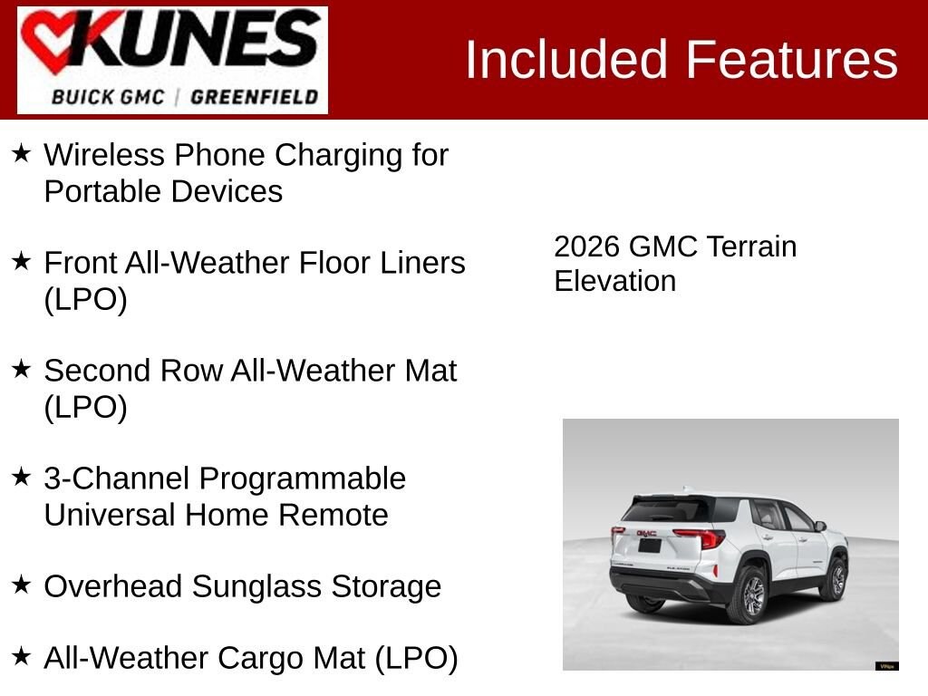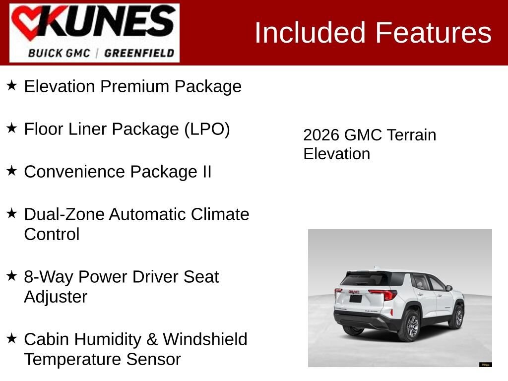 AWD, 2-Way Power Driver Lumbar Seat Adjuster, 3-Channel Programmable Universal Home Remote, 8-Way Power Driver Seat Adjuster, All-Weather Cargo Mat (LPO), AutoSense Hands-Free Power Programmable Liftgate, Brushed Aluminum Roof Rails, Cabin Humidity & Windshield Temperature Sensor, Convenience Package II, CoreTec Seat Trim, Dual-Zone Automatic Climate Control, Elevation Premium Package, Floor Liner Package (LPO), Front All-Weather Floor Liners (LPO), Front Intermittent RainSense Wipers, Heated front seats, Heated steering wheel, Heated Wiper Park, Overhead Sunglass Storage, Second Row All-Weather Mat (LPO), Wireless Phone Charging for Portable Devices. Summit White 2026 GMC Terrain Elevation AWD 8-Speed Automatic with Overdrive 1.5L DOHC