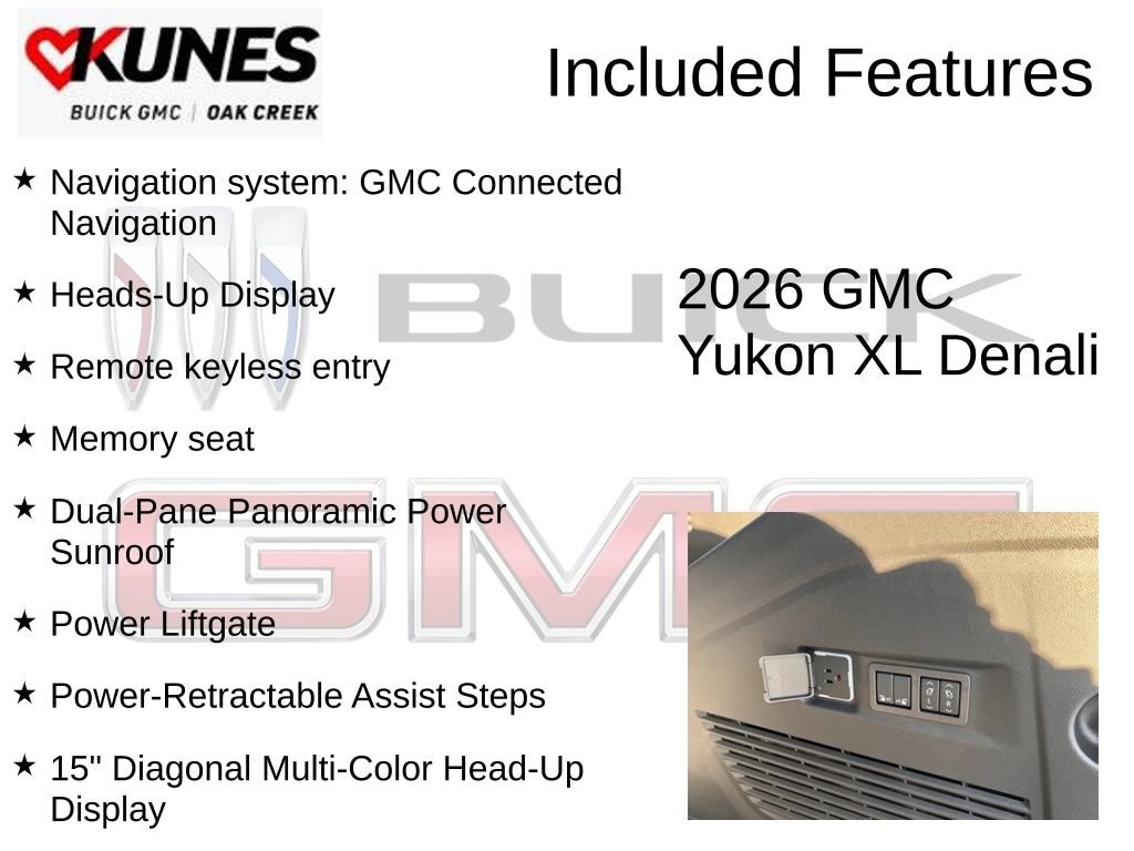 Onyx Black 2026 GMC Yukon XL Denali 4WD 10-Speed Automatic with Overdrive EcoTec3 6.2L V8 4WD, 15 Diagonal Multi-Color Head-Up Display, Apple CarPlay/Android Auto, Dual-Pane Panoramic Power Sunroof, Heads-Up Display, Memory seat, Navigation system: GMC Connected Navigation, Perforated Leather Seating Surfaces, Power Liftgate, Power-Retractable Assist Steps, Remote keyless entry.