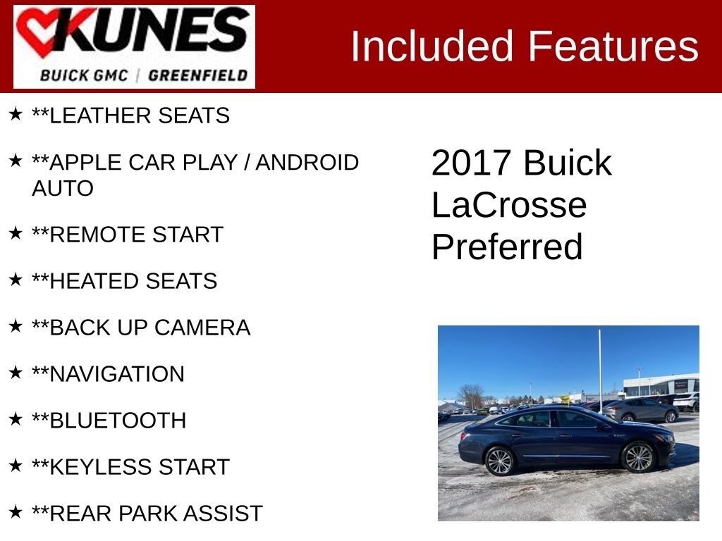 **LEATHER SEATS, **APPLE CAR PLAY / ANDROID AUTO, **REMOTE START, **HEATED SEATS, **BACK UP CAMERA, **NAVIGATION, **BLUETOOTH, **KEYLESS START, **REAR PARK ASSIST, **GREAT FUEL ENCONOMY, **AFFORDABLE FINANCING, **NON SMOKER, **LOCAL TRADE / WELL LOVED!, **CLEAN CARFAX, **KEYLESS ENTRY, 8 Speakers, 8-Speaker Audio System Feature, Black Front & Rear All Weather Floor Mats (LPO), Emergency communication system: OnStar Guidance, Leather Shift Knob, Premium audio system: IntelliLink, Radio data system, Radio: Buick IntelliLink AM/FM Stereo, Wheels: 18 Ultra-Bright Machined-Faced Aluminum. CARFAX One-Owner. Clean CARFAX. Certified. 21/31 City/Highway MPG Recent Arrival!Dark Sapphire Blue Metallic 2017 Buick LaCrosse Preferred 4D Sedan FWD 8-Speed Automatic 3.6L V6 DICertification Program Details:** NO FEAR LIFETIME CERTIFIED PREOWNED **Over $2,895 of value at no cost!*LIFETIME WARRANTY!*3 Day Exchange Policy!*Complimentary powertrain warranty with ability to upgrade to fully comprehensive coverage and/or extend up to 125,000 miles!*125+ Point Inspection by our factory trained ASE Certified technicians and reconditioned to the highest standards.*Complimentary AutoCheck History Report*Complimentary AutoCheck Buyback Protection*Financing for Everyone - Guaranteed credit approval regardless of credit history!*Over 30 lenders who compete to get you the best financing terms*No payments for up to 90 days!*Weekly, Bi-Weekly, and Monthly Payment Options for all buyers!*First Free Oil Change!*Trade anytime policy - cars, trucks, boats, RVs, motorcycles - as long as we donât have to feed it, you can trade it!Find out why our dealerships have won DealerRater.com DEALER OF THE YEAR a whopping 10 TIMES! Call, email, or live chat with one of our friendly sales professionals now to schedule your test drive! Prices shown do not include tax, title, registration and $499 service fees.Awards:* 2017 IIHS Top Safety Pick with optional front crash prevention * 2017 KBB.com 10 Best Luxury Cars Under $35,000 * 2017 KBB.com Brand Image Awards