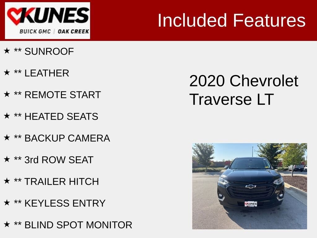 ** SUNROOF, ** LEATHER, ** REMOTE START, ** HEATED SEATS, ** BACKUP CAMERA, ** 3rd ROW SEAT, ** TRAILER HITCH, ** KEYLESS ENTRY, ** BLIND SPOT MONITOR, ** NAVIGATION, ** BLUETOOTH, ** REAR PARK ASSIST, AWD, 3.49 Axle Ratio, Automatic temperature control, Bose Premium 10-Speaker Audio System Feature, Brake assist, Compass, Delay-off headlights, Driver door bin, Driver vanity mirror, Emergency communication system: OnStar and Chevrolet connected services capable, Four wheel independent suspension, Front dual zone A/C, Front reading lights, Garage door transmitter, HD Surround Vision, Hitch Guidance w/Hitch View, Illuminated entry, Occupant sensing airbag, Power Liftgate, Radio data system, Radio: Chevrolet Infotainment 3 Plus System, Rear anti-roll bar, Rear Camera Mirror, Rear reading lights, Rear window wiper, Speed-sensing steering, Telescoping steering wheel, Tilt steering wheel, Trailering Assist Guidelines, Trip computer, Variably intermittent wipers, Voltmeter, Wheels: 18 Bright Silver Painted Aluminum, Wheels: 20 Machined Face Aluminum.Milwaukee's newest Buick GMC with the best available inventory in the midwest.2020 Chevrolet Traverse 3LT 3.6L V6 SIDI VVT 9-Speed Automatic AWD Odometer is 3319 miles below market average!Find out why our dealerships have won DealerRater.com DEALER OF THE YEAR a whopping 10 TIMES! Call, email, or live chat with one of our friendly sales professionals now to schedule your test drive! Prices shown do not include tax, title, registration and $499 service fees.