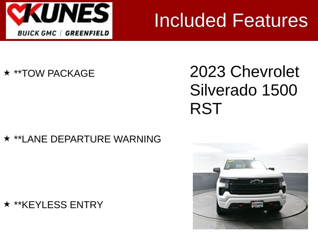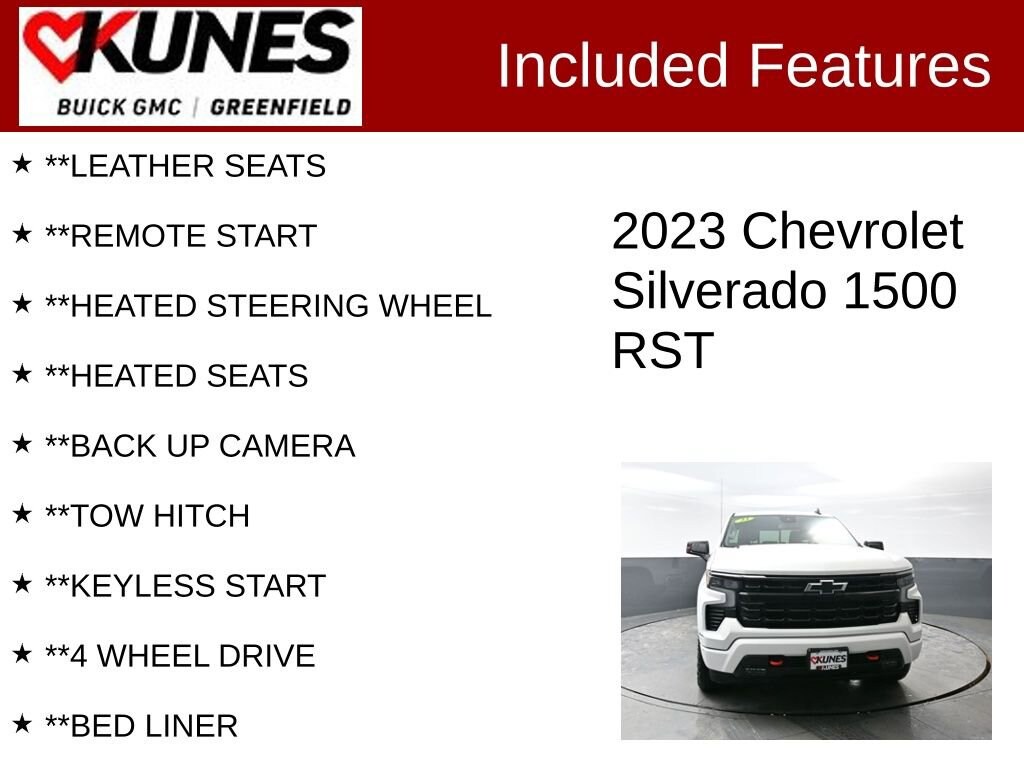 2023 Chevrolet Silverado 1500 RST Summit White 4WD 3.0L I6Recent Arrival! Clean CARFAX. CARFAX One Owner. Redline Edition with aluminum wheels, running boards, and tow hooks Premium sound system, sliding rear window, and universal garage door opener Jet Black leather seats and heated front seats 3.0L I-6 diesel turbocharged engine, four-wheel drive Heated steering wheel and driver adjustable lumbar support Rear bench seat with passthrough storage Bed liner, high-capacity suspension package Rear park assist sensors and backup camera Adaptive cruise control Power driver seat, power locks, and power windows Remote engine start and keyless entry Multi-zone climate control and rear air conditioning Privacy glass and fog lamps LED headlights and daytime running lights Tow package with integrated trailer brake controller Lane departure warning and lane keeping assist Blind spot monitoring and front collision mitigation Satellite radio and auxiliary audio input Front and rear floor mats Dual polished exhaust outlets