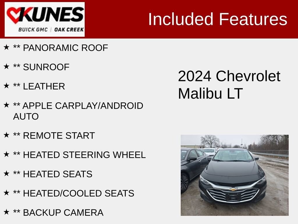 2024 Chevrolet Malibu LT 2LT Mosaic Black Metallic FWD 1.5L DOHCRecent Arrival! CARFAX One Owner. Sunroof Heated front seats Premium sound system Navigation system Rear parking sensors and backup camera Heated steering wheel Power driver and passenger seats Power adjustable lumbar Memory settings for mirrors and seat Automatic headlights and automatic highbeams Remote engine start Keyless entry and push-button start WiFi hotspot capability Android Auto and Apple CarPlay Bluetooth and auxiliary audio input Dual-zone automatic climate control Aluminum wheels with performance tires LED headlamps and tail lamps Driver assistance features: lane keeping assist, lane departure warning, forward collision warning Blind spot monitoring is not shown Tire pressure monitor Security system Rear defrost Leather seating Steering wheel audio controls