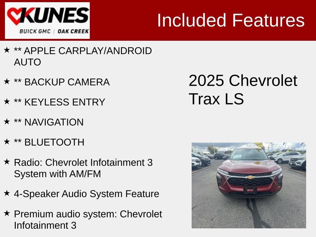 2025 Chevrolet Trax LS Crimson Metallic FWD 1.2L Ecotec Turbo DOHC DI w/VVTRecent Arrival! CARFAX One Owner. License plate front mounting package included LS Preferred Equipment Group features Automatic emergency braking and forward collision alert Lane departure warning with lane keeping assist Back-up camera system Apple CarPlay, Android Auto, Bluetooth, and WiFi hotspot Adaptive cruise control not listed Cloth seats with folding rear bench Rear defrost and adjustable steering wheel Privacy glass and tinted windshield Automatic headlights and highbeams Power mirrors and door locks Tow hooks and rear spoiler AM/FM radio, MP3, and satellite radio capability 6-speed automatic with 1.2L turbocharged engine Front-wheel drive with all-season tires and spare Electronic parking brake and tire pressure monitoring Advanced airbag system for front and rear Traction control, stability control, and security system Rear seat reminder and LATCH child seat anchors Power windows and floor mats included