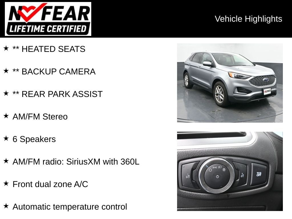 2024 Ford Edge SEL EcoBoost 2.0L I4 GTDi DOHC Turbocharged VCT 8-Speed Automatic AWD CARFAX One-Owner. 21/28 City/Highway MPG