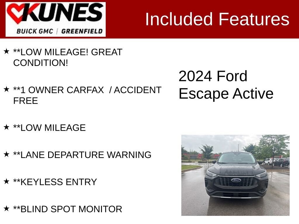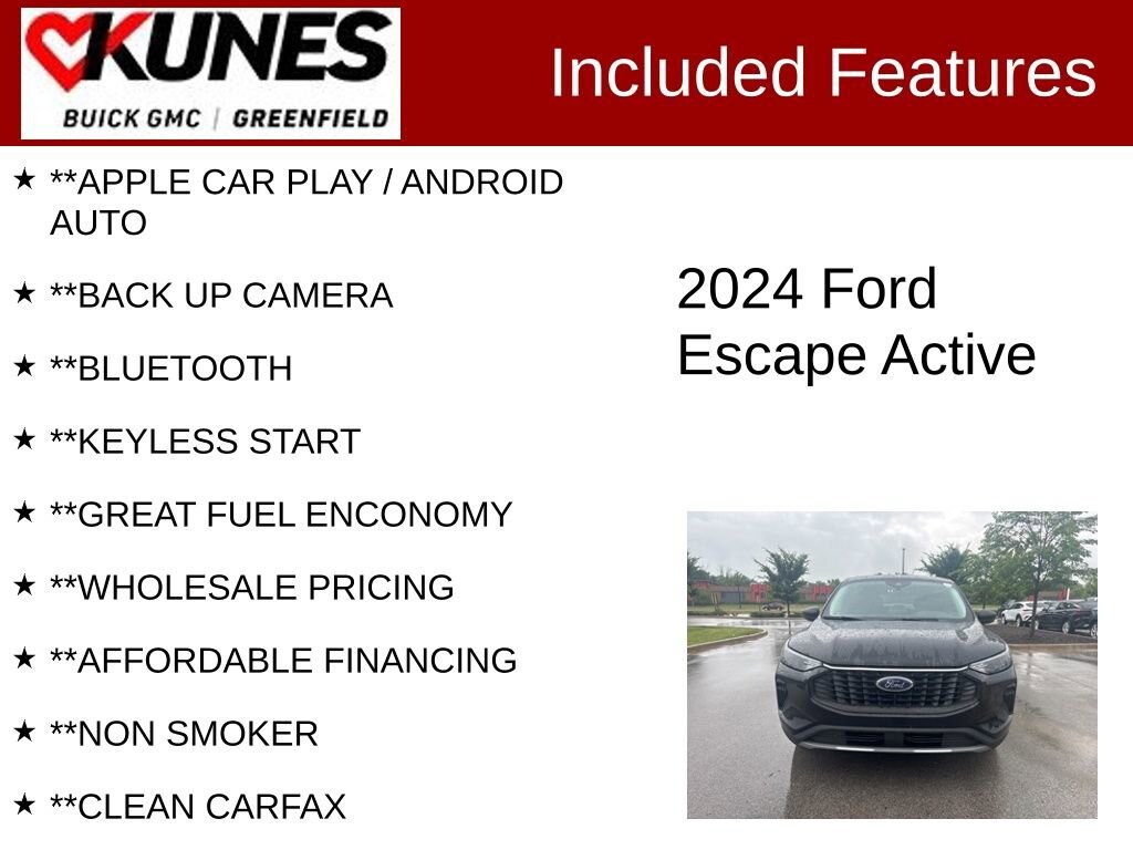 **APPLE CAR PLAY / ANDROID AUTO, **BACK UP CAMERA, **BLUETOOTH, **KEYLESS START, **GREAT FUEL ENCONOMY, **WHOLESALE PRICING, **AFFORDABLE FINANCING, **NON SMOKER, **CLEAN CARFAX, **LOW MILEAGE! GREAT CONDITION!, **1 OWNER CARFAX / ACCIDENT FREE, **LOW MILEAGE, **LANE DEPARTURE WARNING, **KEYLESS ENTRY, **BLIND SPOT MONITOR, Exterior Parking Camera Rear, Power Liftgate. CARFAX One-Owner. Clean CARFAX. Certified. 27/34 City/Highway MPG Recent Arrival! Odometer is 6825 miles below market average! Priced below KBB Fair Purchase Price!Black Metallic 2024 Ford Escape Active 4D Sport Utility FWD 8-Speed Automatic 1.5L EcoBoostCertification Program Details:** NO FEAR LIFETIME CERTIFIED PREOWNED **Over $2,895 of value at no cost!*LIFETIME WARRANTY!*3 Day Exchange Policy!*Complimentary powertrain warranty with ability to upgrade to fully comprehensive coverage and/or extend up to 125,000 miles!*125+ Point Inspection by our factory trained ASE Certified technicians and reconditioned to the highest standards.*Complimentary AutoCheck History Report*Complimentary AutoCheck Buyback Protection*Financing for Everyone - Guaranteed credit approval regardless of credit history!*Over 30 lenders who compete to get you the best financing terms*No payments for up to 90 days!*Weekly, Bi-Weekly, and Monthly Payment Options for all buyers!*First Free Oil Change!*Trade anytime policy - cars, trucks, boats, RVs, motorcycles - as long as we donât have to feed it, you can trade it!Find out why our dealerships have won DealerRater.com DEALER OF THE YEAR a whopping 10 TIMES! Call, email, or live chat with one of our friendly sales professionals now to schedule your test drive! Prices shown do not include tax, title, registration and $499 service fees.