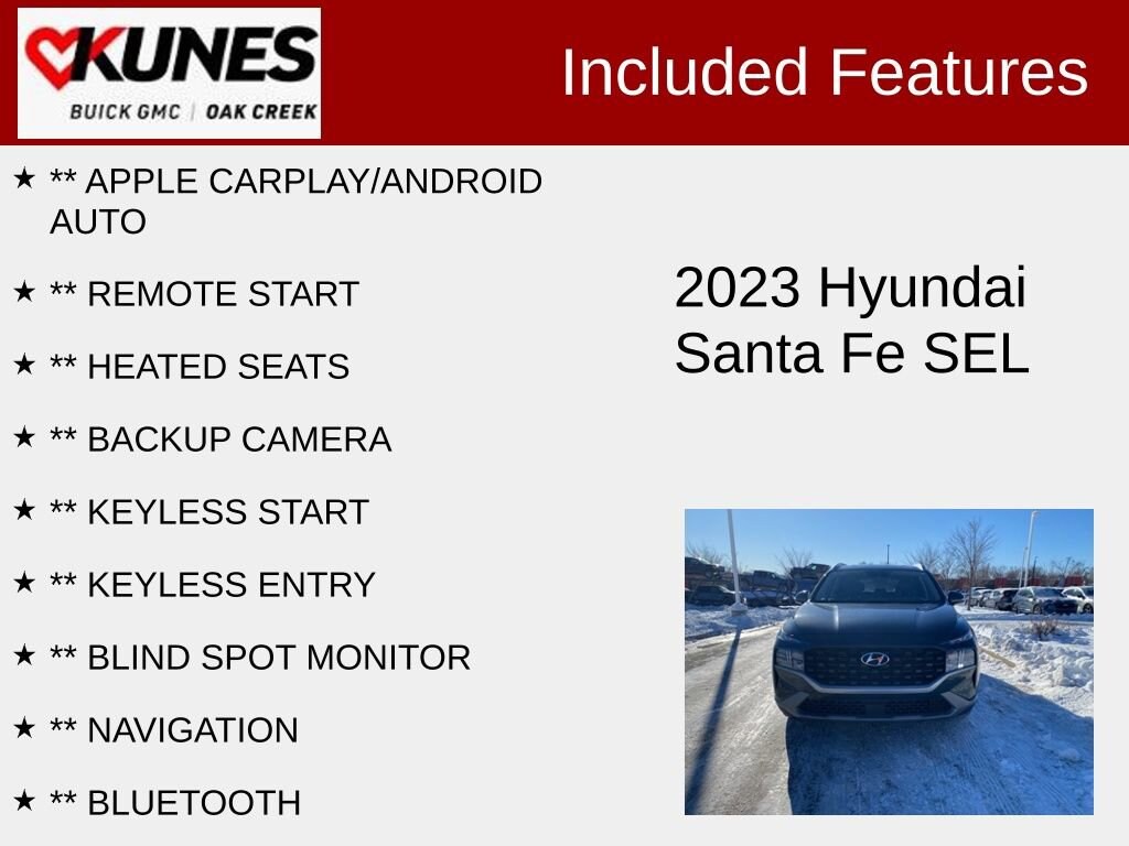 2023 Hyundai Santa Fe SEL Portofino Gray FWD 2.5L I4Recent Arrival! CARFAX One Owner. Option Group 01 package included Adaptive cruise control for added convenience Heated front seats with power driver's seat and adjustable lumbar Navigation system and smart device integration Blind spot monitoring and rear cross-traffic alert Back-up camera and lane departure warning Keyless entry with push-button start and remote engine start Power liftgate with hands-free trunk release Dual-zone automatic climate control Apple CarPlay and Android Auto capability Leather-wrapped and adjustable steering wheel Satellite radio, HD radio, and Bluetooth audio Multi-view airbags including front, side, and curtain Rear parking sensors and stability/traction control LED headlights and daytime running lights Alloy wheels and privacy glass Rear bench pass-through and cargo area concealed storage Power windows, door locks, and mirrors Towing equipment included Driver monitoring system for safety