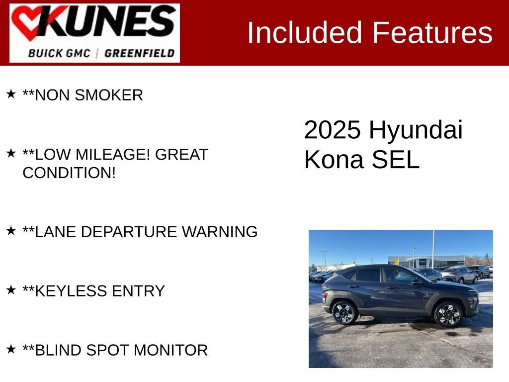 **APPLE CAR PLAY / ANDROID AUTO, **REMOTE START, **HEATED SEATS, **BACK UP CAMERA, **BLUETOOTH, **KEYLESS START, **REAR PARK ASSIST, **GREAT FUEL ENCONOMY, **AFFORDABLE FINANCING, **NON SMOKER, **LOW MILEAGE! GREAT CONDITION!, **LANE DEPARTURE WARNING, **KEYLESS ENTRY, **BLIND SPOT MONITOR, Bumpers: body-color, Front anti-roll bar, Front Center Armrest, Front reading lights, Front wheel independent suspension, Illuminated entry, Occupant sensing airbag, Outside temperature display, Overhead airbag, Panic alarm, Passenger door bin, Passenger vanity mirror, Radio: AM/FM/HD Radio/SiriusXM Audio System, Rear seat center armrest, Rear window wiper, Speed control, Speed-sensing steering, Split folding rear seat, Tachometer, Telescoping steering wheel, Tilt steering wheel, Variably intermittent wipers, Wheels: 18 x 7.0J Glossy Black Alloy. CARFAX One-Owner. Certified. 28/35 City/Highway MPG Recent Arrival!Denim Blue 2025 Hyundai Kona SEL 4D Sport Utility FWD CVT 2.0L I4 DOHC 16VCertification Program Details:** NO FEAR LIFETIME CERTIFIED PREOWNED **Over $2,895 of value at no cost!*LIFETIME WARRANTY!*3 Day Exchange Policy!*Complimentary powertrain warranty with ability to upgrade to fully comprehensive coverage and/or extend up to 125,000 miles!*125+ Point Inspection by our factory trained ASE Certified technicians and reconditioned to the highest standards.*Complimentary AutoCheck History Report*Complimentary AutoCheck Buyback Protection*Financing for Everyone - Guaranteed credit approval regardless of credit history!*Over 30 lenders who compete to get you the best financing terms*No payments for up to 90 days!*Weekly, Bi-Weekly, and Monthly Payment Options for all buyers!*First Free Oil Change!*Trade anytime policy - cars, trucks, boats, RVs, motorcycles - as long as we donât have to feed it, you can trade it!Find out why our dealerships have won DealerRater.com DEALER OF THE YEAR a whopping 10 TIMES! Call, email, or live chat with one of our friendly sales professionals now to schedule your test drive! Prices shown do not include tax, title, registration and $499 service fees.