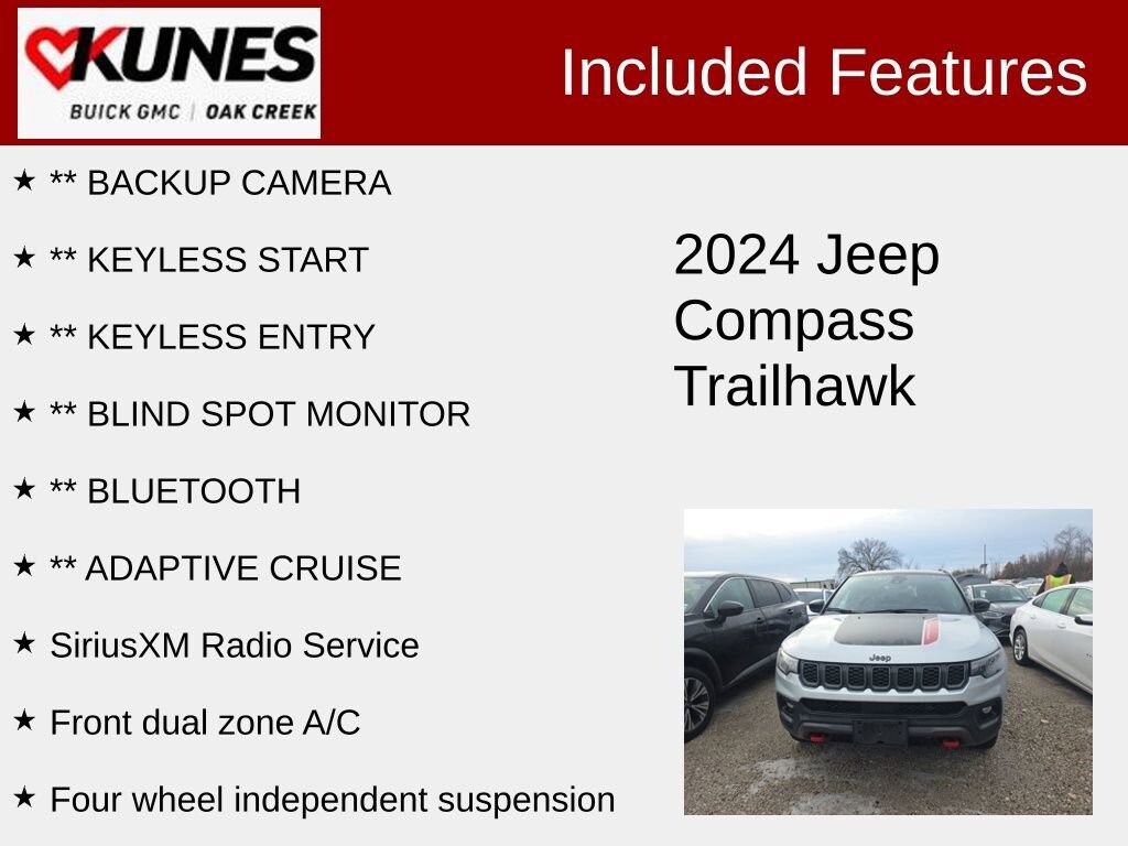 2024 Jeep Compass Trailhawk Silver Zynith Metallic Clearcoat 4WD 2.0L I4 DOHCRecent Arrival! CARFAX One Owner. Silver Zenith Metallic Clearcoat paint Heated mirrors with integrated turn signal indicators Premium sound system Adaptive cruise control Blind spot monitor and cross-traffic alert Rear backup camera Lane departure warning with lane keeping assist 10.1-inch touchscreen display Dual-zone automatic climate control Power windows and power door locks Keyless entry and push-button start Bluetooth connectivity and smart device integration Apple CarPlay and Android Auto support Fog lamps and LED headlights All-terrain tires on aluminum wheels Rain-sensing and variable speed intermittent wipers Off-road suspension and 4 skid plates 8-speed automatic transmission with dual shift mode Anti-lock brakes, brake assist, and stability control Multiple airbags including front, side, and knee airbags