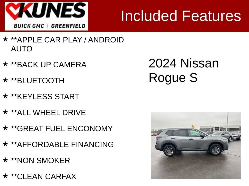 **APPLE CAR PLAY / ANDROID AUTO, **BACK UP CAMERA, **BLUETOOTH, **KEYLESS START, **ALL WHEEL DRIVE, **GREAT FUEL ENCONOMY, **AFFORDABLE FINANCING, **NON SMOKER, **CLEAN CARFAX, **LOW MILEAGE! GREAT CONDITION!, **1 OWNER CARFAX / ACCIDENT FREE, **LOW MILEAGE, AWD, 4 Speakers, 4-Wheel Disc Brakes, 5.676 Axle Ratio, ABS brakes, AM/FM radio: SiriusXM, Dual front side impact airbags, Four wheel independent suspension, Front anti-roll bar, Knee airbag, Low tire pressure warning, Occupant sensing airbag, Overhead airbag, Radio data system, Radio: AM/FM NissanConnect, Rear anti-roll bar, Rear Parking Sensors, Rear side impact airbag, Remote keyless entry, Steering wheel mounted audio controls, Traction control. CARFAX One-Owner. Clean CARFAX. Certified. 28/35 City/Highway MPG Recent Arrival! Odometer is 4863 miles below market average!Gun Metallic 2024 Nissan Rogue S 4D Sport Utility AWD CVT with Xtronic 1.5L DOHCCertification Program Details:** NO FEAR LIFETIME CERTIFIED PREOWNED **Over $2,895 of value at no cost!*LIFETIME WARRANTY!*3 Day Exchange Policy!*Complimentary powertrain warranty with ability to upgrade to fully comprehensive coverage and/or extend up to 125,000 miles!*125+ Point Inspection by our factory trained ASE Certified technicians and reconditioned to the highest standards.*Complimentary AutoCheck History Report*Complimentary AutoCheck Buyback Protection*Financing for Everyone - Guaranteed credit approval regardless of credit history!*Over 30 lenders who compete to get you the best financing terms*No payments for up to 90 days!*Weekly, Bi-Weekly, and Monthly Payment Options for all buyers!*First Free Oil Change!*Trade anytime policy - cars, trucks, boats, RVs, motorcycles - as long as we donât have to feed it, you can trade it!Find out why our dealerships have won DealerRater.com DEALER OF THE YEAR a whopping 10 TIMES! Call, email, or live chat with one of our friendly sales professionals now to schedule your test drive! Prices shown do not include tax, title, registration and $499 service fees.
