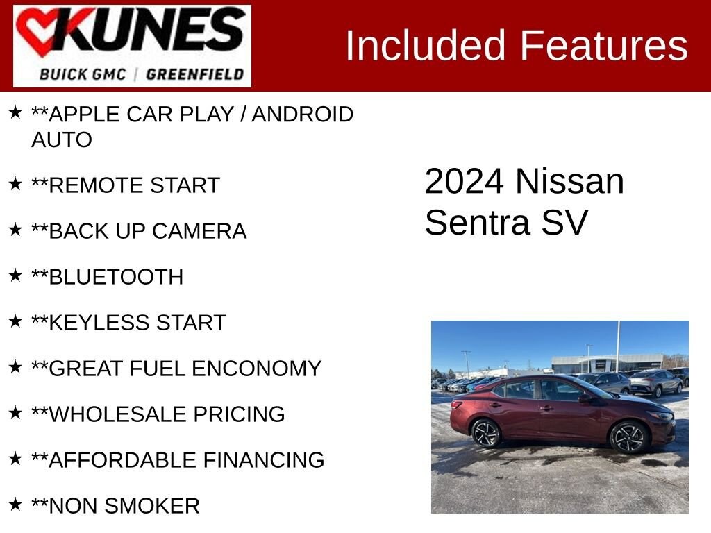 **APPLE CAR PLAY / ANDROID AUTO, **REMOTE START, **BACK UP CAMERA, **BLUETOOTH, **KEYLESS START, **GREAT FUEL ENCONOMY, **WHOLESALE PRICING, **AFFORDABLE FINANCING, **NON SMOKER, **CLEAN CARFAX, **LOW MILEAGE! GREAT CONDITION!, **1 OWNER CARFAX / ACCIDENT FREE, **LOW MILEAGE, **LANE DEPARTURE WARNING, **KEYLESS ENTRY, **BLIND SPOT MONITOR, CVT with Xtronic, Charcoal Cloth. Clean CARFAX. Certified. 30/40 City/Highway MPG Recent Arrival!Rosewood 2024 Nissan Sentra SV 4D Sedan FWD CVT with Xtronic 2.0L I4 DOHCCertification Program Details:** NO FEAR LIFETIME CERTIFIED PREOWNED **Over $2,895 of value at no cost!*LIFETIME WARRANTY!*3 Day Exchange Policy!*Complimentary powertrain warranty with ability to upgrade to fully comprehensive coverage and/or extend up to 125,000 miles!*125+ Point Inspection by our factory trained ASE Certified technicians and reconditioned to the highest standards.*Complimentary AutoCheck History Report*Complimentary AutoCheck Buyback Protection*Financing for Everyone - Guaranteed credit approval regardless of credit history!*Over 30 lenders who compete to get you the best financing terms*No payments for up to 90 days!*Weekly, Bi-Weekly, and Monthly Payment Options for all buyers!*First Free Oil Change!*Trade anytime policy - cars, trucks, boats, RVs, motorcycles - as long as we donât have to feed it, you can trade it!Find out why our dealerships have won DealerRater.com DEALER OF THE YEAR a whopping 10 TIMES! Call, email, or live chat with one of our friendly sales professionals now to schedule your test drive! Prices shown do not include tax, title, registration and $499 service fees.